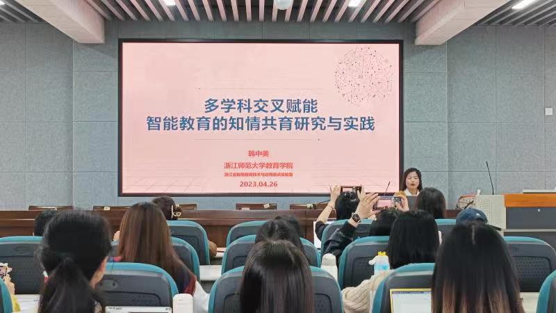 韩中美博士在讲座开始阶段,总体的概述了多学科交叉赋能智能教育的知情共育这一概念。指出这一概念是指在国家重大战略需求驱动下,各种学科与人工智能,大数据相互融合。而这一理念能够恰当解决当前知情失衡的问题。在此之后,韩中美提出了知情共育的“两大内涵”与“三大特点”,指出在教育过程中应当明确教育核心内容,模糊边界范围的理论依据。从显性形态和隐性逻辑两方面解释了如何让教育接受者进行全面发展,剔除应当交叉“物理变化”,融合“化学变化”的教学方法。