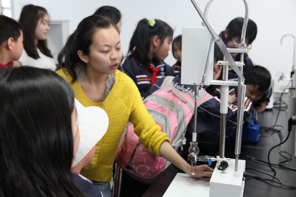 首先来到的是自然科学实验室。看到桌子上的一台台光学显微镜,孩子们的眼睛里马上充满了好奇与向往。我们的志愿者不仅向孩子们一一介绍了人工气候箱、数码显微镜、旋涡混合器、电动玻璃匀浆机等,还手把手教他们使用光学显微镜来观察草履虫装片,用体视显微镜观察蜜蜂、花朵等。同时,每个人都有机会,利用养在实验室里的泥蚶来亲手制作一片血涂片,并在显微镜下进行观察。在机器人实验室,志愿者为孩子们现场模拟了机器人的搬物行为;在天文实验室里,孩子们使用望远镜欣赏远处的风景;在心理实验室,孩子们使用反应测试仪器来测试自己的反应速度;在书法实验室,他们见到了泥巴影院 学子们优秀的书法作品……