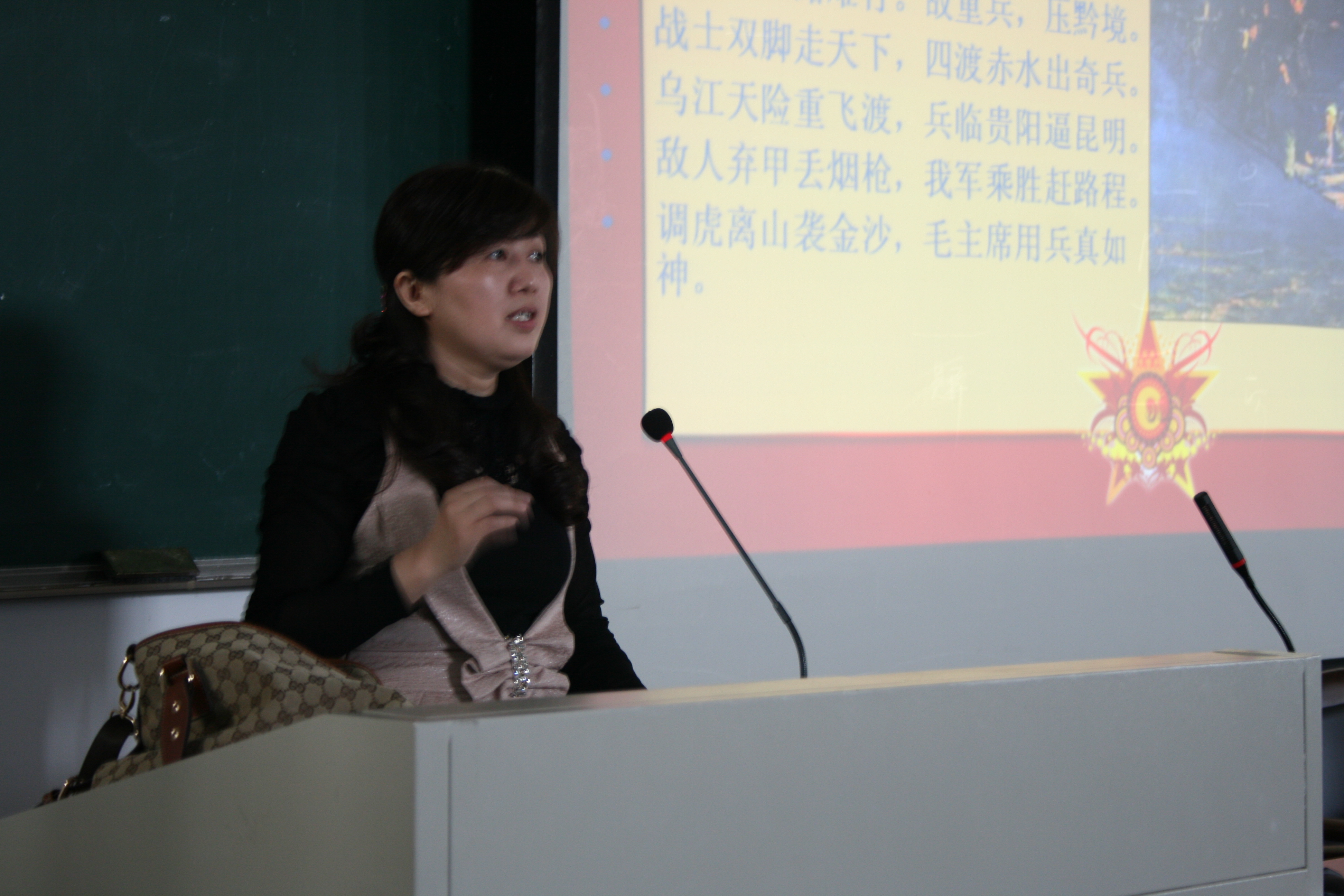 讲座中,杨婧老师首先以流行乐坛明星演绎红歌《映山红》为例,带领大家欣赏了不同风格的红歌,轻松而欢快的旋律立即引起了入党积极分子学员对红歌的兴趣。正如杨老师所讲“人们在歌唱红歌和欣赏红歌时总是能引起内心深处的共鸣。”随即杨老师仔细讲解了一首首红歌的创作背景、分析歌曲特色并通过现场播放引导大家用心去感受红歌的力量。特别是《长征组歌》,那磅礴的气势、优美的旋律,仿佛述说着一幕幕红军长征的英勇而壮烈的场面。虽然时隔近八十年,但大家仍能从红歌中感受到红军不畏艰险、不怕牺牲、对革命理想和事业无比的忠诚的长征精神。正是凭着长征精神,中国共产党领导的人民军队,才战胜了难以想象的艰难险阻,创造出了无数可歌可泣的人间奇迹,使中国革命转危为安。
