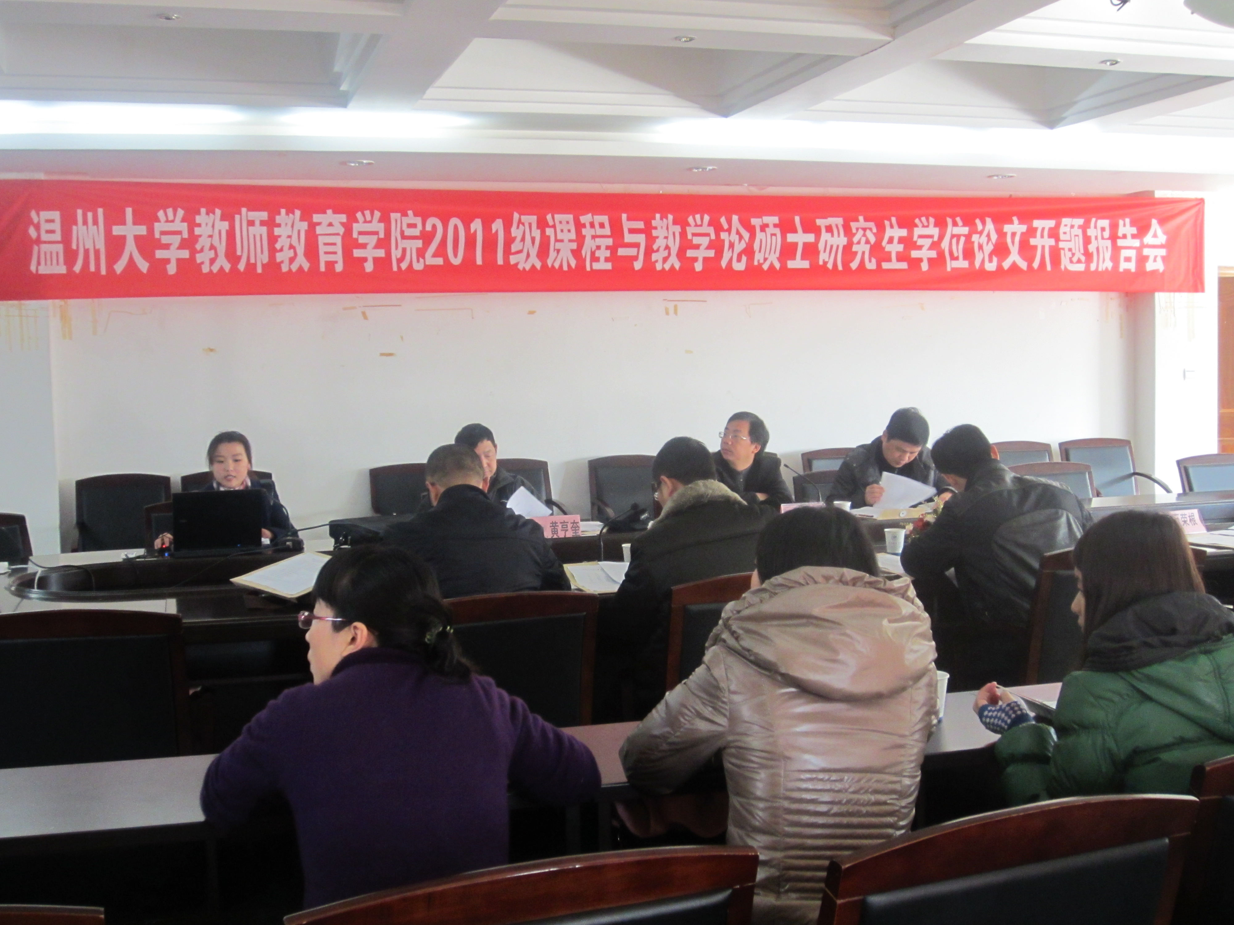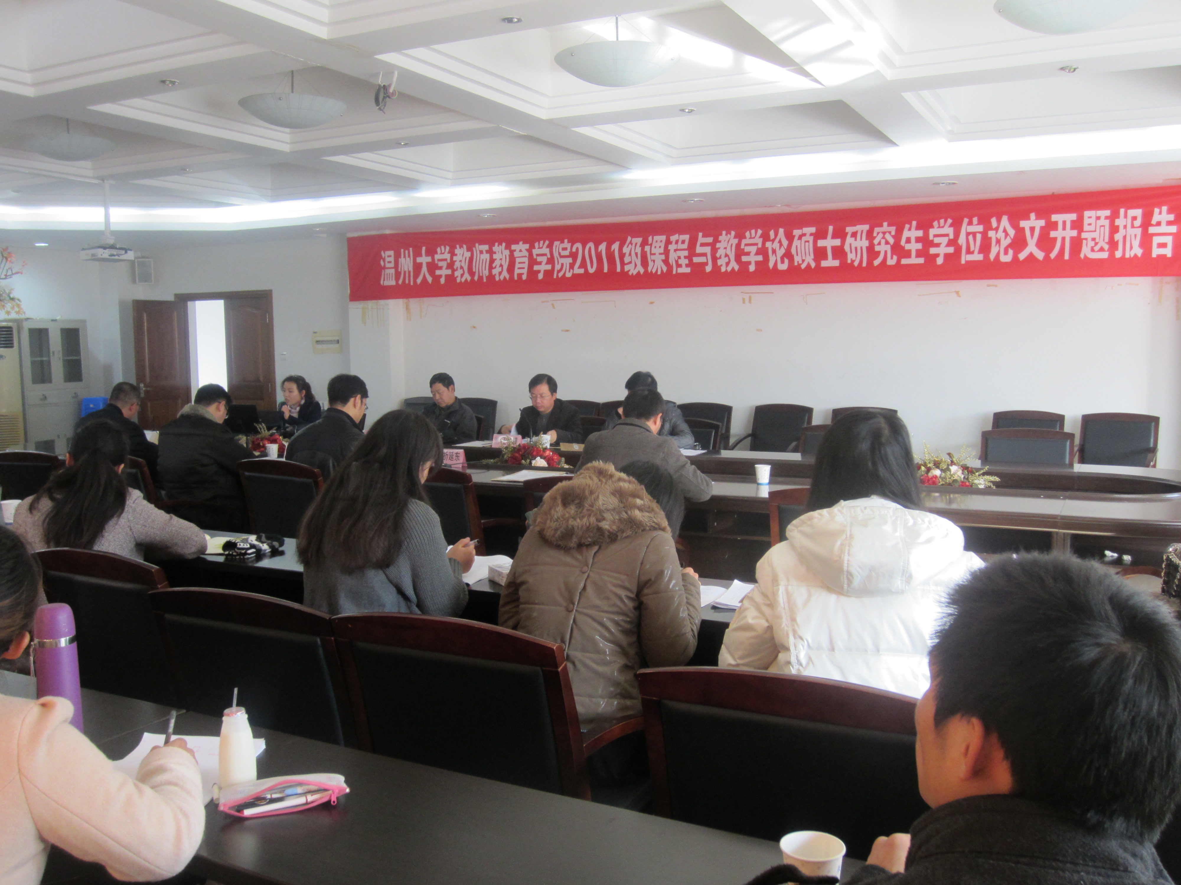 2011级研究生毕业论文开题报告会在北校区行政楼125会议室和418会议室召开。开题报告会分教育综合和信息技术组、教育心理学组两组同时进行,分别由胡来林教授和徐速教授主持,郑信军、胡瑜、王佑镁等12位评议组成员以及11级、12级全体研究生参加此次开题报告会。