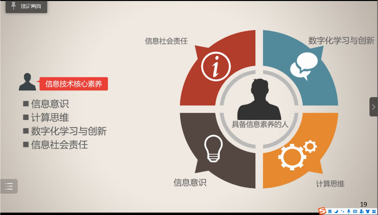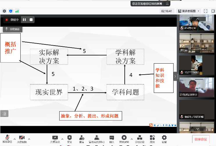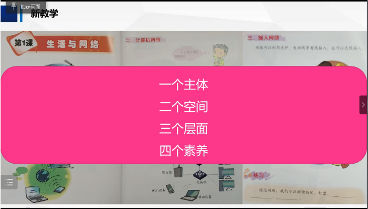 也凭借着自己教学中积累的经验和丰富的阅历,给学生们讲解和分析了《生活与网络》一课的内容,从一个主体、二个空间、三个层面以及四个素养几个角度出发,评价了四位一线老师同课异构的教学思路,融合四个方面对一线教师提出新的需求。