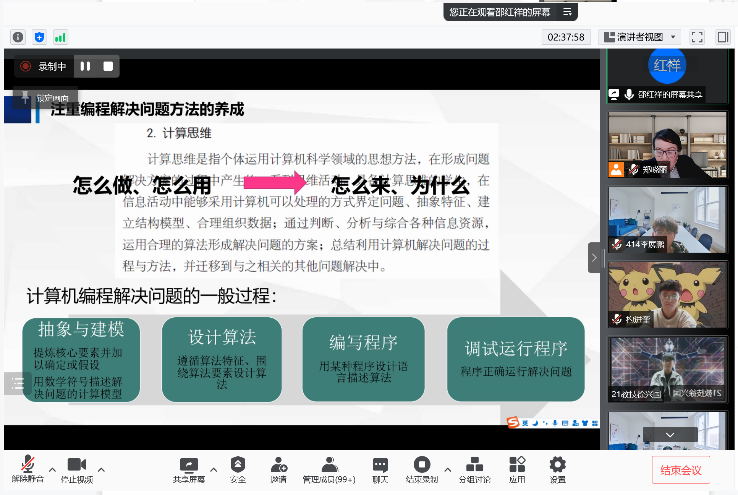 对于初中信息技术学科,邵老师强调了算法作为解决问题的方法和途径的重要性,对于课堂的问题情境案例设置需要符合实际生活,避免出现知识与生活相脱离的情况出现,并指出新的项目化学习思路与任务驱动法学习的异同,认为不可将两者看作相对的概念,并提出将两者进行融合的新思路。