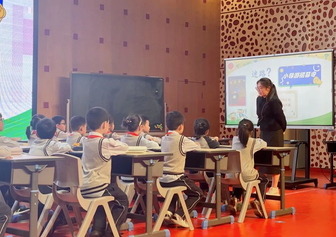 在第三节课中,舒鑫婷、项淑怡老师带来了《争做学校小导游》课程。舒鑫婷老师借助图片,联系生活实际,引导学生了解各项体育活动,并借助句式介绍丰富的活动。“过几天,来自肯恩大学的英语外教要来到我们学校,我们还可以用英语向他介绍。”项淑怡老师开展了英语教学,孩子们用双语介绍校园,各个落落大方,语言流畅,声情并茂地介绍着操场、食堂、书吧……“可是,同学们会写的字不多,要用什么代替这些字?”数学老师带来了好方法,利用箭头将几个地点连起来进行路线规划。最后,孩子们进行小组合作,运用所学的方法用中英文介绍自己的学校,真正做到了融会贯通。