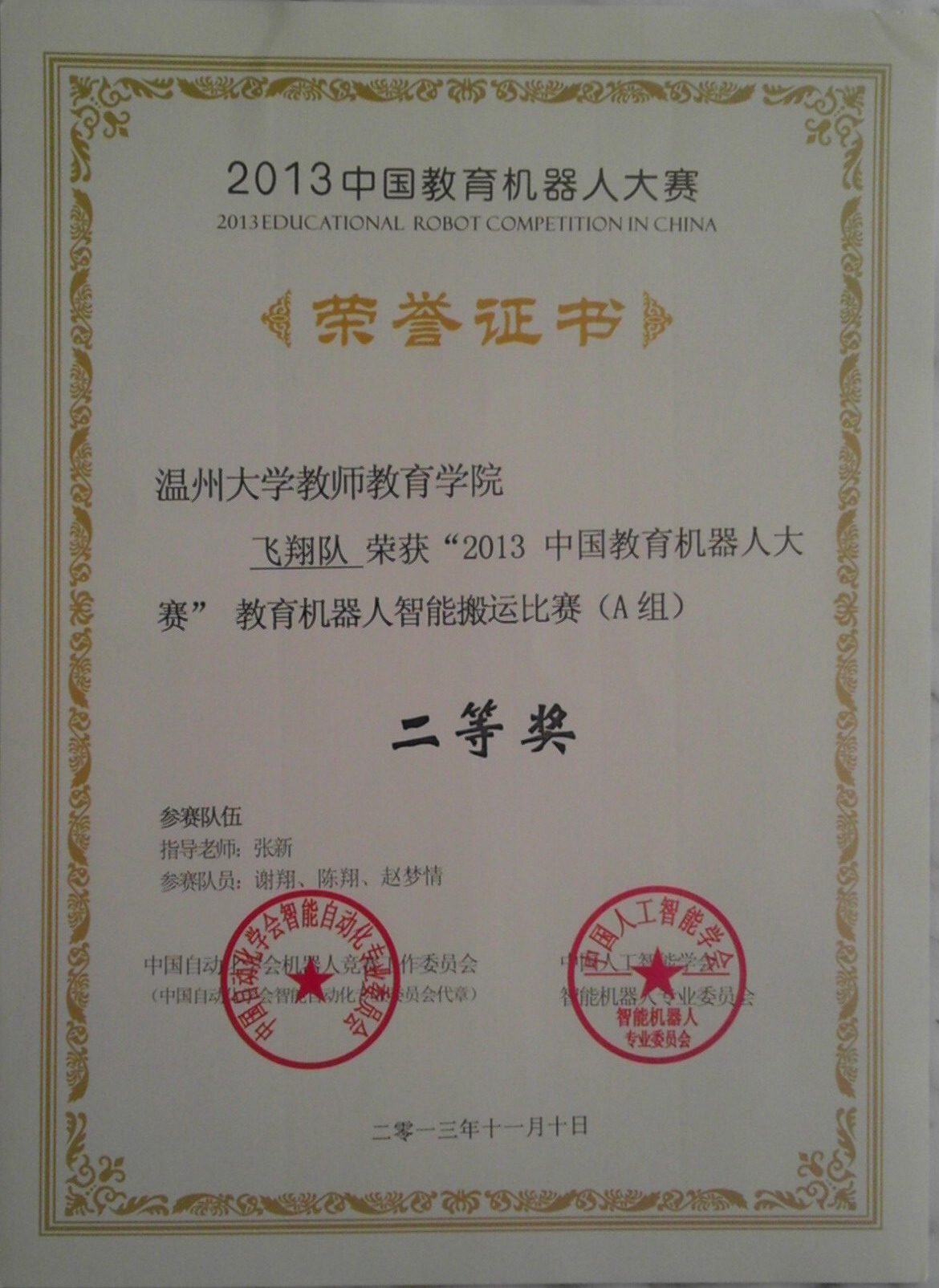 2013年11月9-10日,由中国自动化学会机器人竞赛工作委员会、中国人工智能学会主办2013中国教育机器人大赛在南京工程学院举行,来自全国大中专院校的130多支队伍参赛。比赛的两天时间里,进行机器人创意设计、机器人擂台、机器人智能搬运、机器人搬运码垛、机器人灭火、机器人游中国等比赛。由泥巴影院 小学教育系11小教科学班的谢翔、陈翔、赵梦情组成、张新老师指导的泥巴影院 教师泥巴影院 飞翔队荣获“2013中国教育机器人大赛教育机器人智能搬运比赛(A组)二等奖。