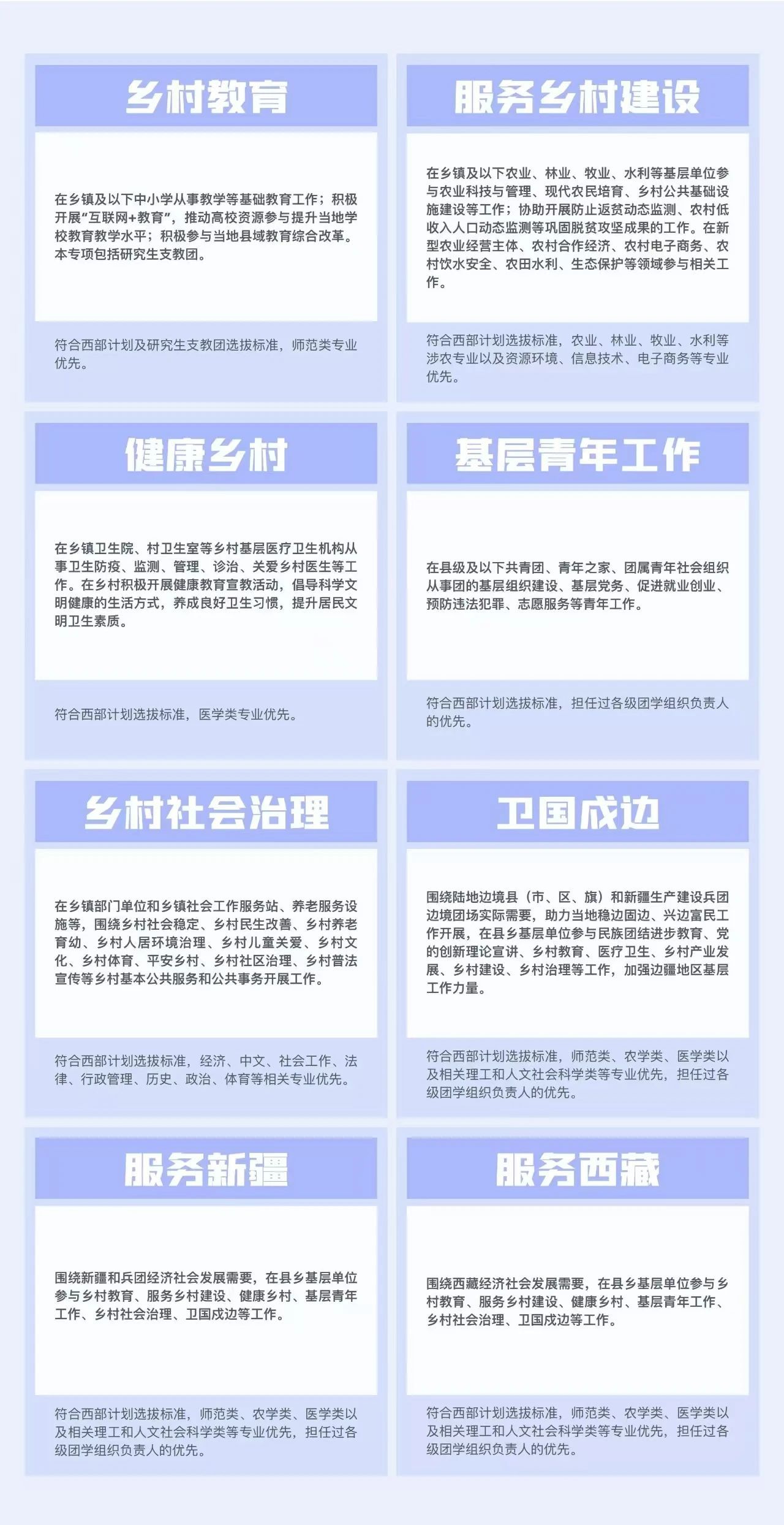 西部计划设置乡村教育、服务乡村建设、健康乡村、基层青年工作、乡村社会治理、卫国戍边、服务新疆、服务西藏8个专项。西部计划志愿者服务期为1至3年,服务协议一年一签。