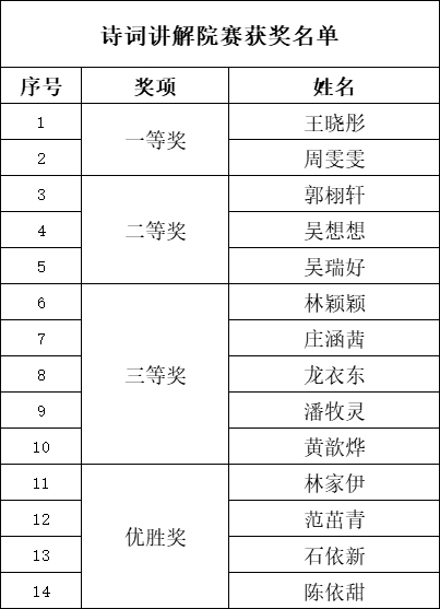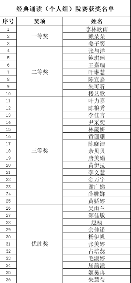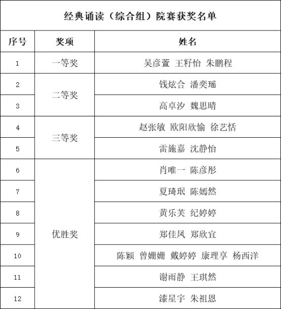 由学院主办,泥巴影院 第十三届大学生中华经典诵写讲大赛——“典润之江”经典诵读竞赛于3月19日进行。本次竞赛,分为经典诵读个人组、综合组和诗词讲解个人组。经典诵读个人组有37位同学报名参赛,综合组有12组29位同学报名参赛,诗词讲解个人组有14位同学参赛。经过院内评委评审,经典诵读个人组评出一等奖3名,二等奖7名,三等奖15名,优胜奖11名;经典诵读综合组评出一等奖1组,二等奖2组,三等奖2组,优胜奖7组;诗词讲解个人组评出一等奖2名,二等奖3名,三等奖5名,优胜奖4名,现将获奖名单公布如下。公示时间从即日起至3日内,欢迎广大老师、同学监督。如有老师、同学对获奖名单有异议,请与教学科付老师联系,联系电话:86596156。