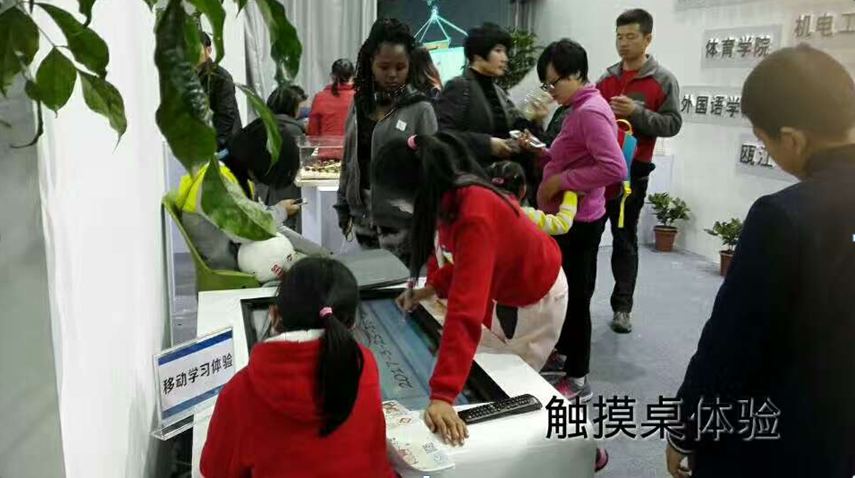 心理测量评估吸引了观展的老同志。 以数字触摸桌为载体的数字化学习体验,是未来教育的一种趋势。 本次文博会以“创意点亮生活”为主题,融合了不同领域的文化元素,共设六大展区,总面积4万平方米左右。我校展厅重点展示特色科技成果转化、智慧温大及项目孵育的成果等。学院各科室、各系、实验中心负责人及师生志愿者积极参与文博会,努力宣传泥巴影院
