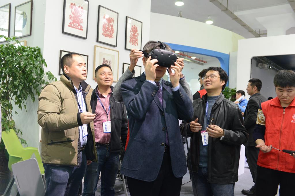 李校堃校长饶有兴趣地体验虚拟学习场景和恐高场景漫游。