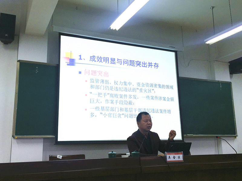 本次大会特邀校党委委员、纪委书记吴金法同志来院做题为《廉洁从教,立德树人》的专题报告。吴书记结合自己深厚的理论功底和多年的纪委工作经验,向与会教师详细介绍了党风廉政建设和反腐败斗争总体态势。他在报告中提到,当前反腐败工作成效明显与问题突出并存,防治力度加大和腐败现象易发多发并存,群众对反腐败期望值不断上升和腐败现象短期内难以根治并存,滋生腐败的土壤依然存在,反腐败形势依然严峻复杂。高校也不再是一片净土,从近期中纪委查出的一系列高校违纪违规案件中,我们也发现高校腐败案存在腐败主体高学历、高职级,腐败领域集中、腐败窝案较多的特征。在反腐斗争中,我们既不能丧失信心,更不能掉以轻心。作为高校教师,特别是培养未来教师的老师们,我们要以“忠诚”守住政治底线,以“自觉”守住道德底线,以“规范”守住法律底线,以“敬畏”守住纪律底线,真正做到廉洁从教,立德树人。吴书记的报告资料丰富、数据翔实,用例旁征博引、数据详实,语言深入浅出、言简意赅,台下的老师们不时报以热烈的掌声。