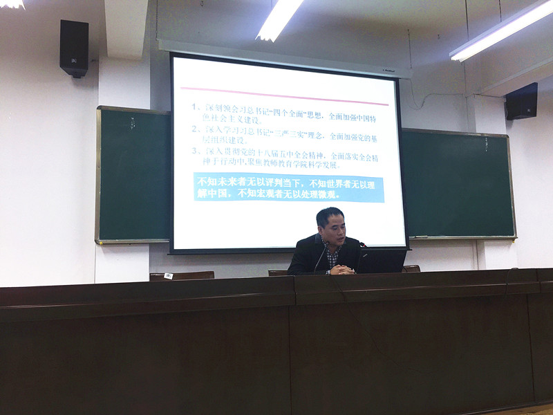 杨立淮书记在本次大会上做十八届五中全会精神解读的辅导报告。他从“户口”“教育”“就业”“二孩”“收入”“脱贫”“科研”“价格”“环保”“社保”等广大教师关心的关键词切入,为大家认真解读了十八届五中全会公报。他在报告的结尾,以“不知未来者无以评判当下,不知世界者无以理解中国,不知宏观者无以处理微观”这句话与大家共勉,号召全体教师要深刻领会习近平总书记“四个全面”思想,全面加强中国特色社会主义建设;要深入学习习近平总书记“三严三实”理念,全面加强党的基层组织建设;深入贯彻党的十八届五中全会精神,全面落实全会精神于行动中,聚焦教师泥巴影院