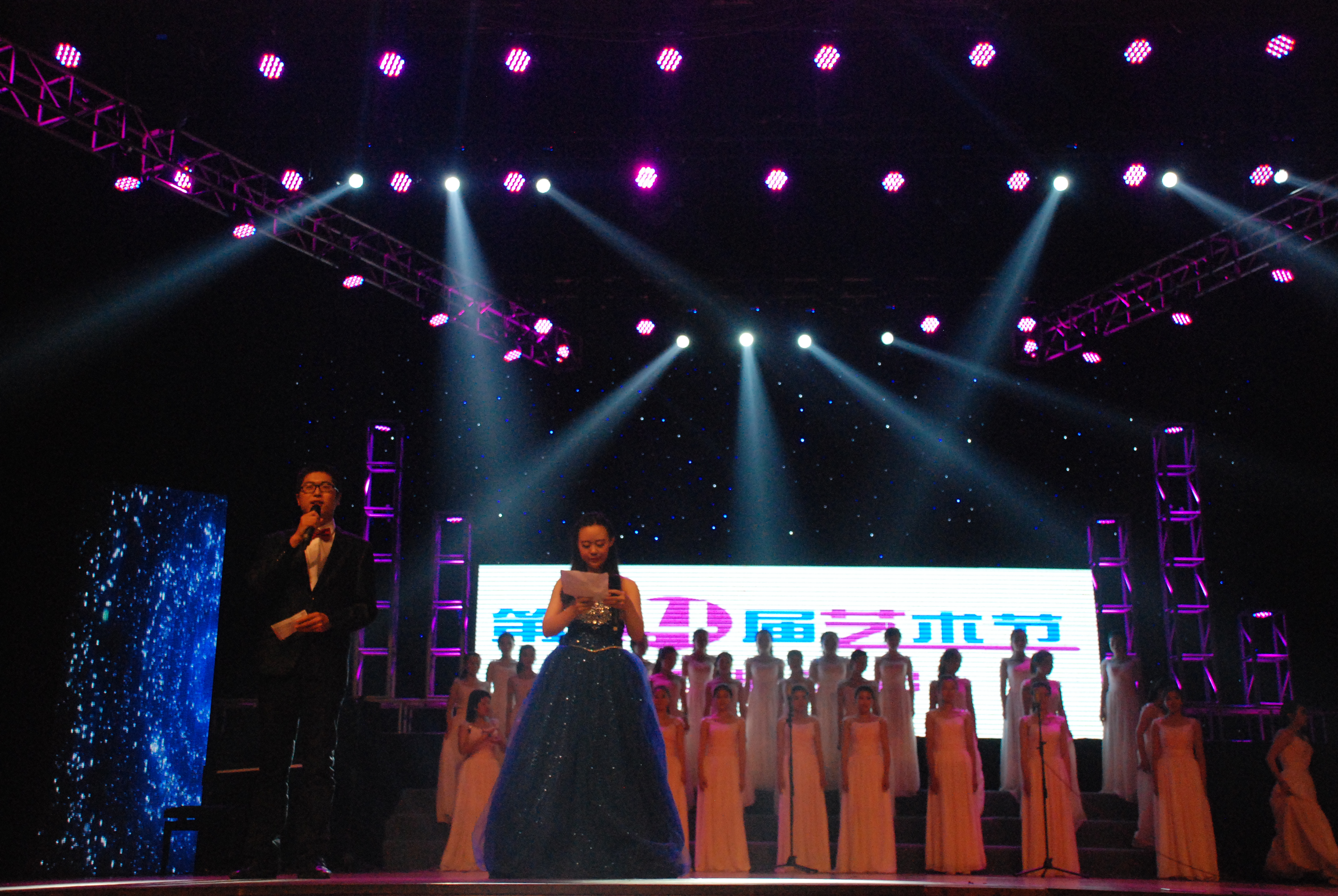 健美操队以一场热辣的健美操为本次汇报演出拉开了序幕,主持人在简单的介绍后,就开始了本次表演。这次的节目都是从本届“艺术之春”的比赛中脱颖而出的优秀表演,群舞、合唱、重奏、朗诵、儿童剧等,各种形式的节目应接不暇,场下的观众也保持着高涨的热情为台上的表演者们加油。