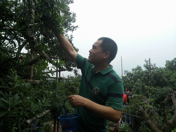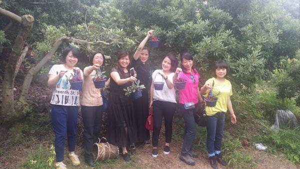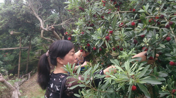 13:30,根据事先的安排,学院40多人分乘10几辆车子,组成了一支不小的车队,浩浩荡荡自驾来到茶山贾宅村。每人提着一个小篮子,开始上山摘杨梅。刚一上山,就见路边树上挂满了红彤彤的杨梅,直让人咽口水。经过一小段山路的攀登,来到指定地点,大家马上就忙活开了,纷纷开始边摘边吃,一边还不忘了用手机拍照留念。直到肚子吃饱,小篮子装满,出了一身汗,大家才依依不舍地下山回来。