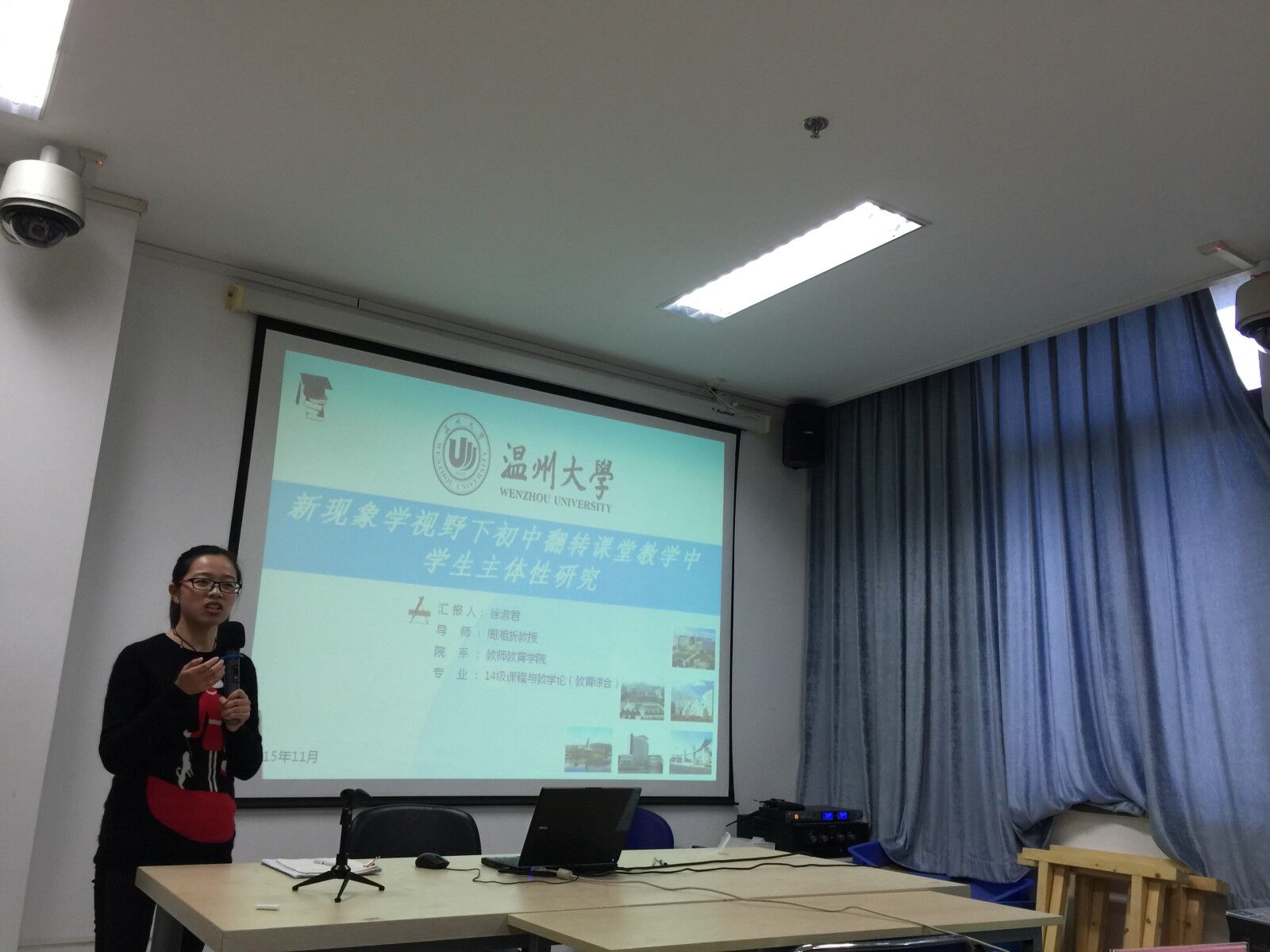 此次校际交流论坛由泥巴影院 研会主席王庆超与杭师大泥巴影院 研会主席姜霞主持。会议伊始,杭师大仲玉英院长致欢迎辞,折延东老师对温杭校际交流会的历史渊源做简单介绍并预祝此次交流圆满成功。会中,双方研究生依次交流了各自关注的学术问题,新颖独特的研究视角、丰富多样的研究内容以及汇报同学激情澎湃的论述、台下同学踊跃的提问质疑,无不吸引着与会者的眼球,会场学术氛围甚浓。师生们从研究内容、研究方法、研究视角、应用前景等方面聚集互联网时代下教育的改革与创新。会议在徐淑君同学的“新现象学视野下初中翻转课堂教学中学生主体性研究”中步入高潮,张华老师从跨学科意识、鲜明的问题意识、创造的意识三方面对此研究给与较高的评价与肯定,同学们也纷纷赞同。这让我们对互联网时代下教育的改革创新与跨学科的研究意识有了新的感悟与收获。