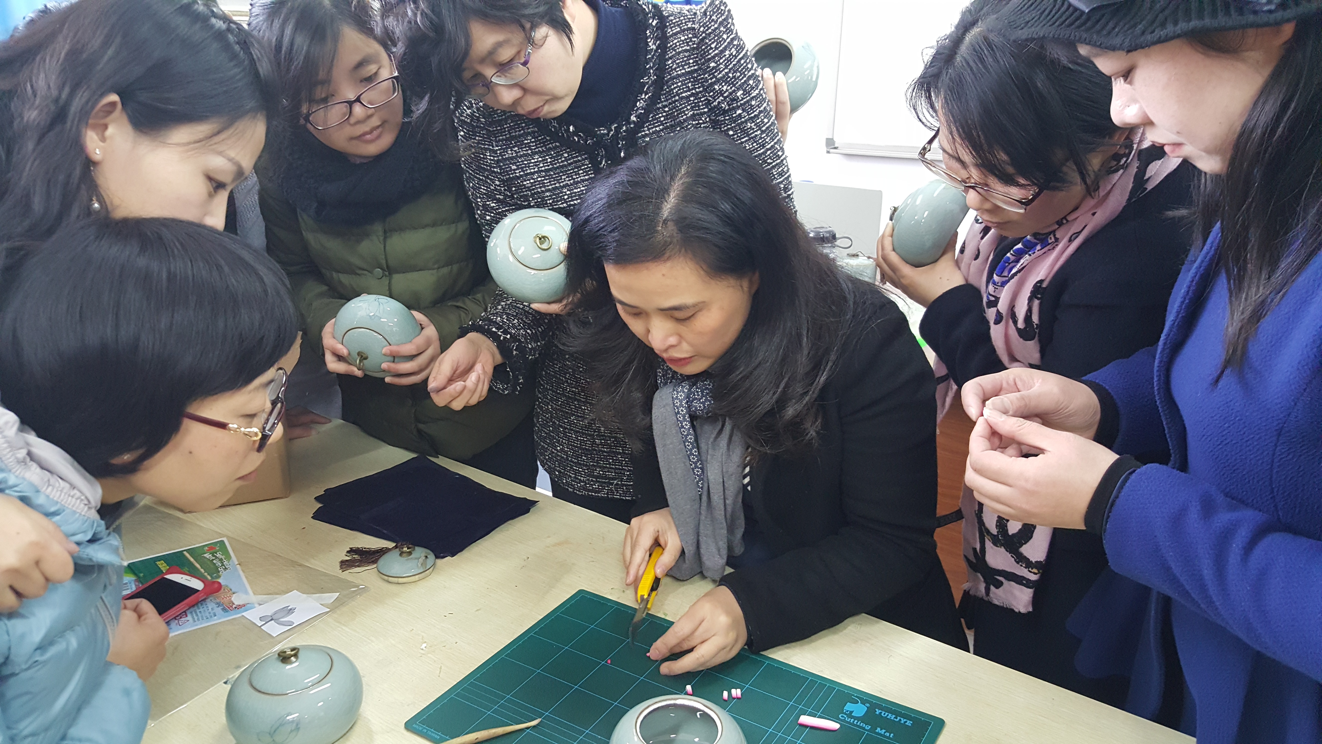 女老师们认真学习瓯塑工艺,制作了一件属于自己的瓯塑作品。