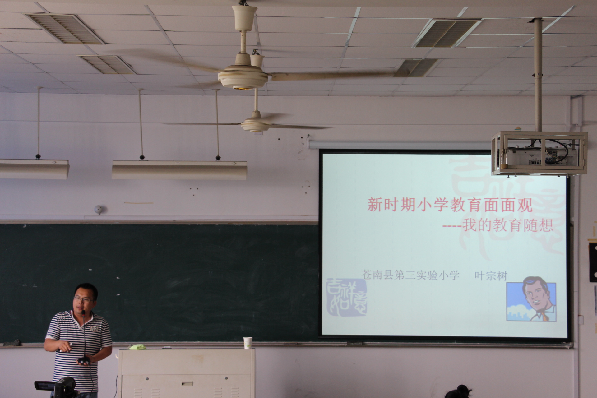 在北3-302召开了名师大讲堂活动。本次活动邀请到了温州苍南县第三实验小学叶宗树老师,讲座主题是:新时期小学教育面面观。活动由小教系主办,小教工作室承办,谭莉老师主持。出席本次活动的有13级小教全体同学。