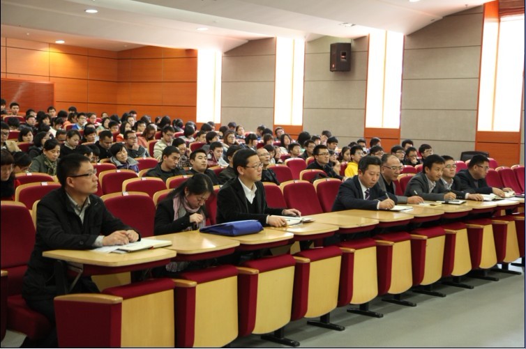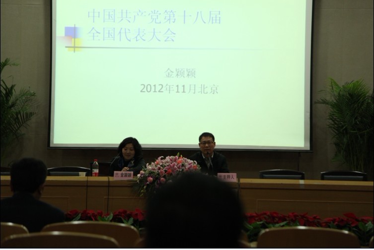 报告伊始,蔡联群同志代表两院对金颖颖代表的到来表示热烈的欢迎,学生代表为金颖颖同志献花。报告会上,金颖颖同志以党的十八大代表的视角,结合自己在十八大期间的所见所闻所感,简要介绍了中国共产党第十八次全国代表大会的召开盛况、大会主题、特点和选举情况,并从不同视角阐述代表们关注的政治体制改革、文化强国、党的建设、社会建设等八方面的热点问题。金代表在对会议主要精神做全面深入的传达和解读的基础上,深入剖析了十八大报告中的理论创新和亮点,诸如对科学发展观作出了新的定位;对坚持和发展中国特色社会主义道路作出了新的阐述;对中国特色社会主义总体布局作出了新的拓展;对全面建成小康社会和深化改革提出了新的要求;对加快转变经济发展方式提出了新的认识;对社会主义核心价值观进行了新的概括等。
