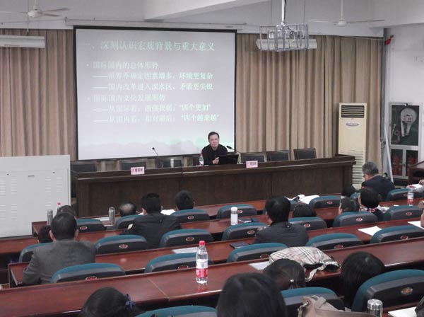 潘部长首先分析了《中共中央关于深化文化体制改革、推动社会主义文化大发展大繁荣若干重大问题的决定》的构成,在此基础上分五个篇章解读十七届六中全会精神,分别为:深刻认识宏观背景与重大意义、深刻认识巨大成就与机遇挑战、深刻认识一条道路与一个目标、深刻认识重要任务与重大举措、深刻认识政治责任与领导责任。在报告过程中,潘部长结合国际国内形势、为数不少的社会不良现象、让人揪心的网络案例,以风趣幽默的语言风格,为大家解读和分析了《决定》的精神。
