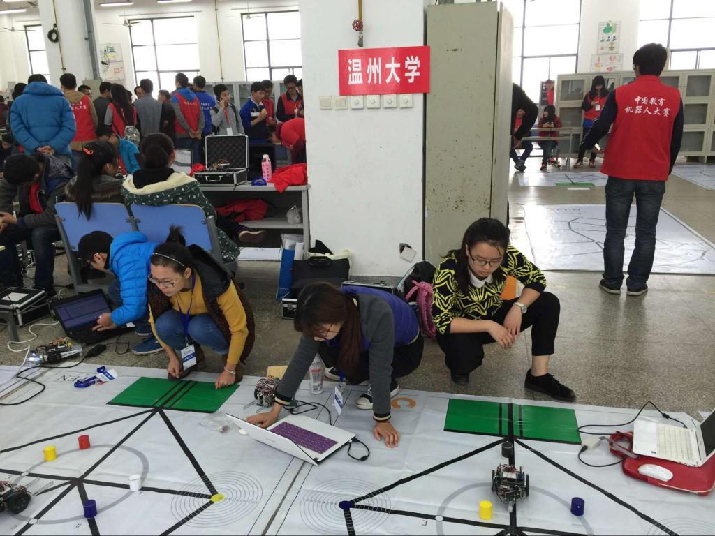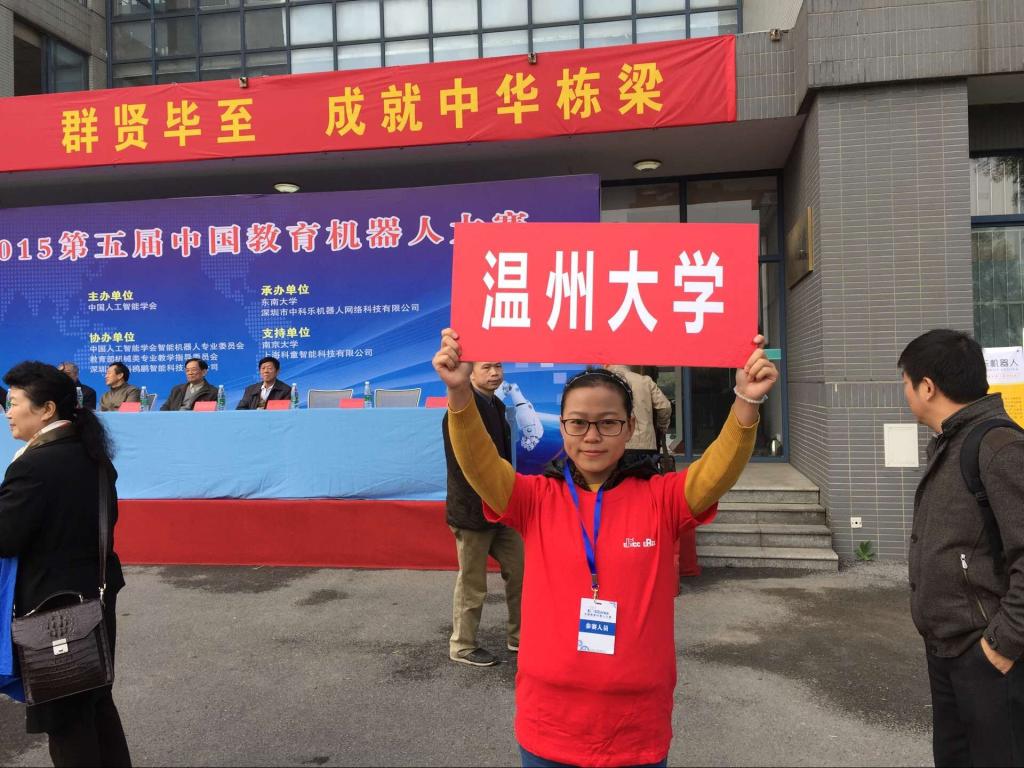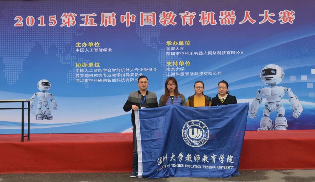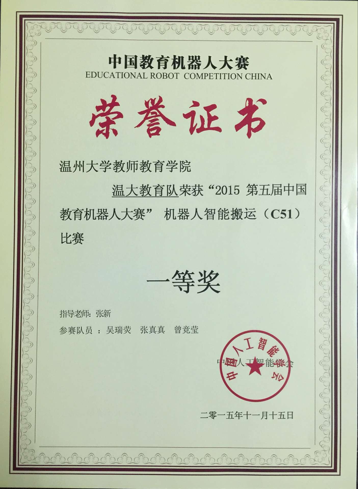 2015年11月14-15日,由中国人工智能学会主办的第五届中国教育机器人大赛在南京东南大学举行,参赛的有来自全国大中院校的200多支队伍。在比赛的两天时间里,分别进行了机器人智能搬运(C51)、机器人创意设计、机器人擂台、机器人搬运码垛、机器人灭火、机器人游中国等比赛。由张新老师指导的,泥巴影院 小学教育系12科学班的吴瑞荧以及13数学班的张真真、曾竞莹组成的泥巴影院 教育队不畏强手,奋勇拼搏,取得“2015中国教育机器人大赛”智能搬运比赛(C51组)一等奖的佳绩,为学校争了光!