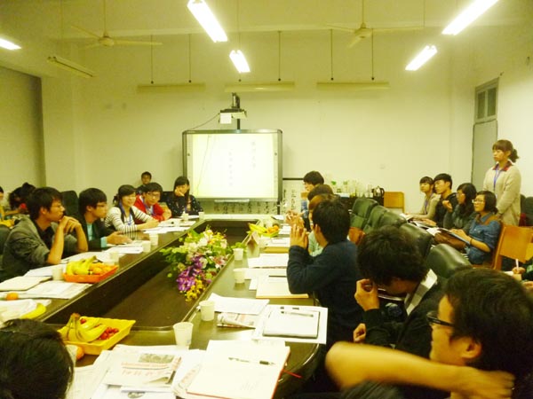 交流会由院学生会主席邱雨庭同学主持并汇报工作。她汇报本学期的迎新工作,例如组织学生会干部为为新生清洗电风扇、为新生初到学校报到与父母留影、国庆期间组织新疆新生游温州走进同学家庭等,这些贴心工作受到了兄弟学院学生会主席的赞赏,一些学院当场表示明年的迎新也要办一个这样的活动,让现场的泥巴影院