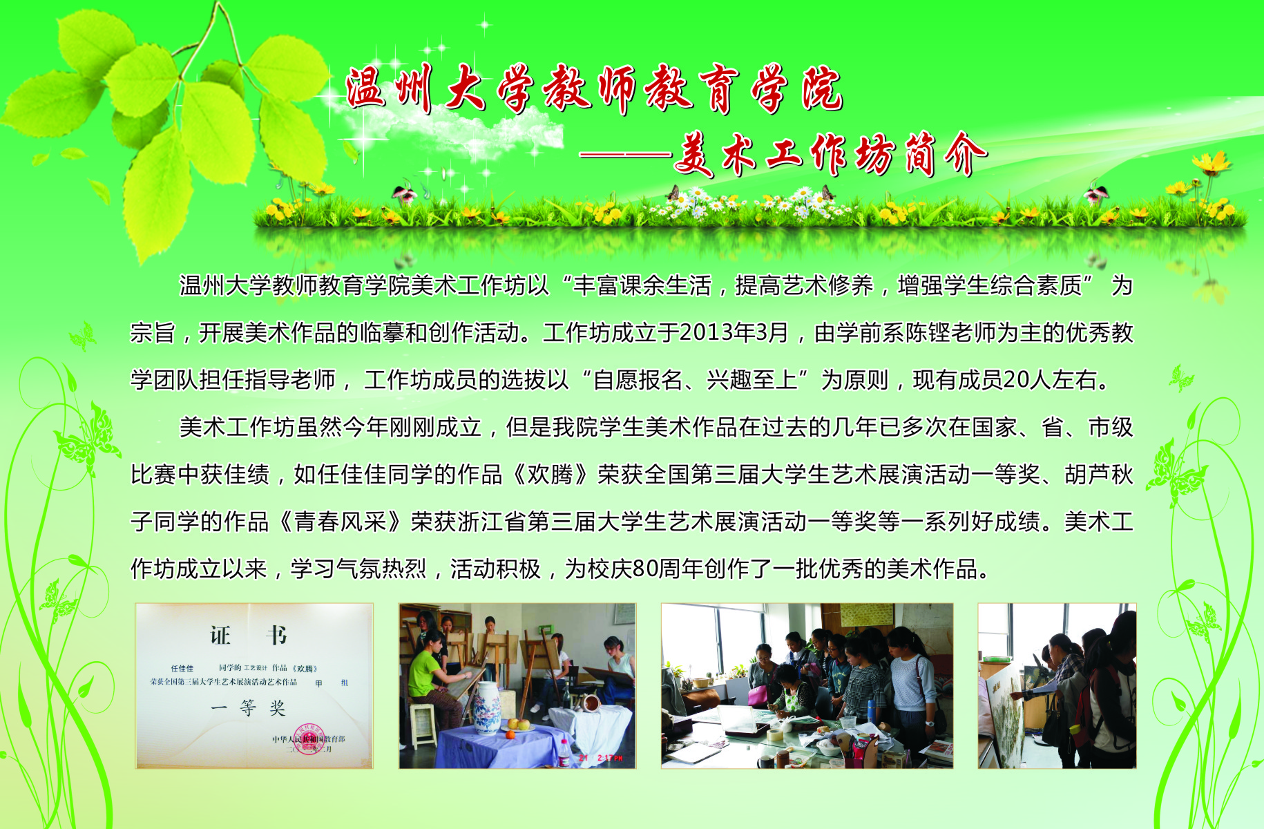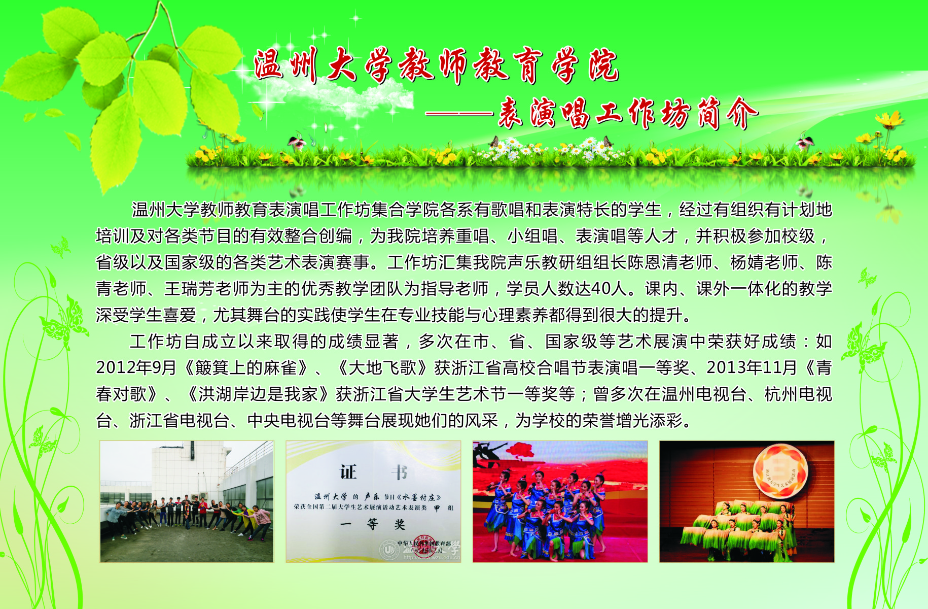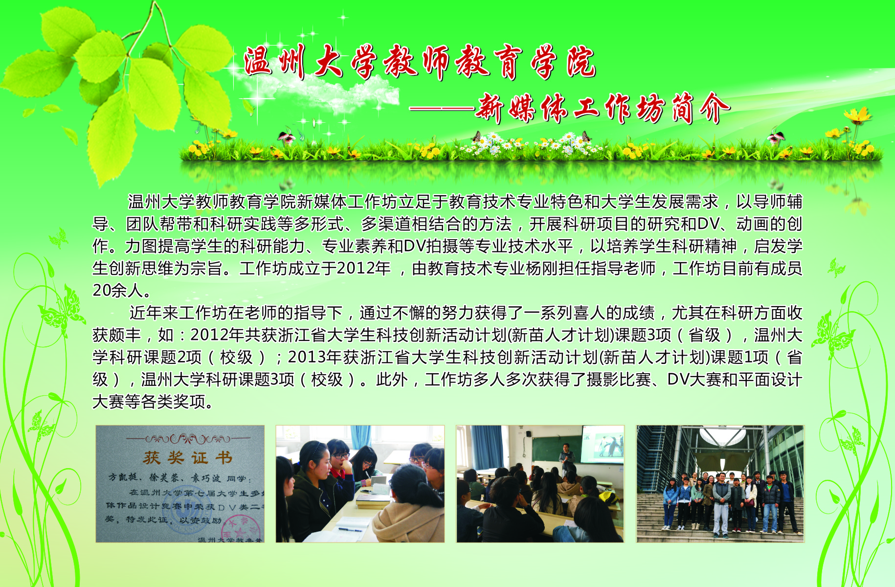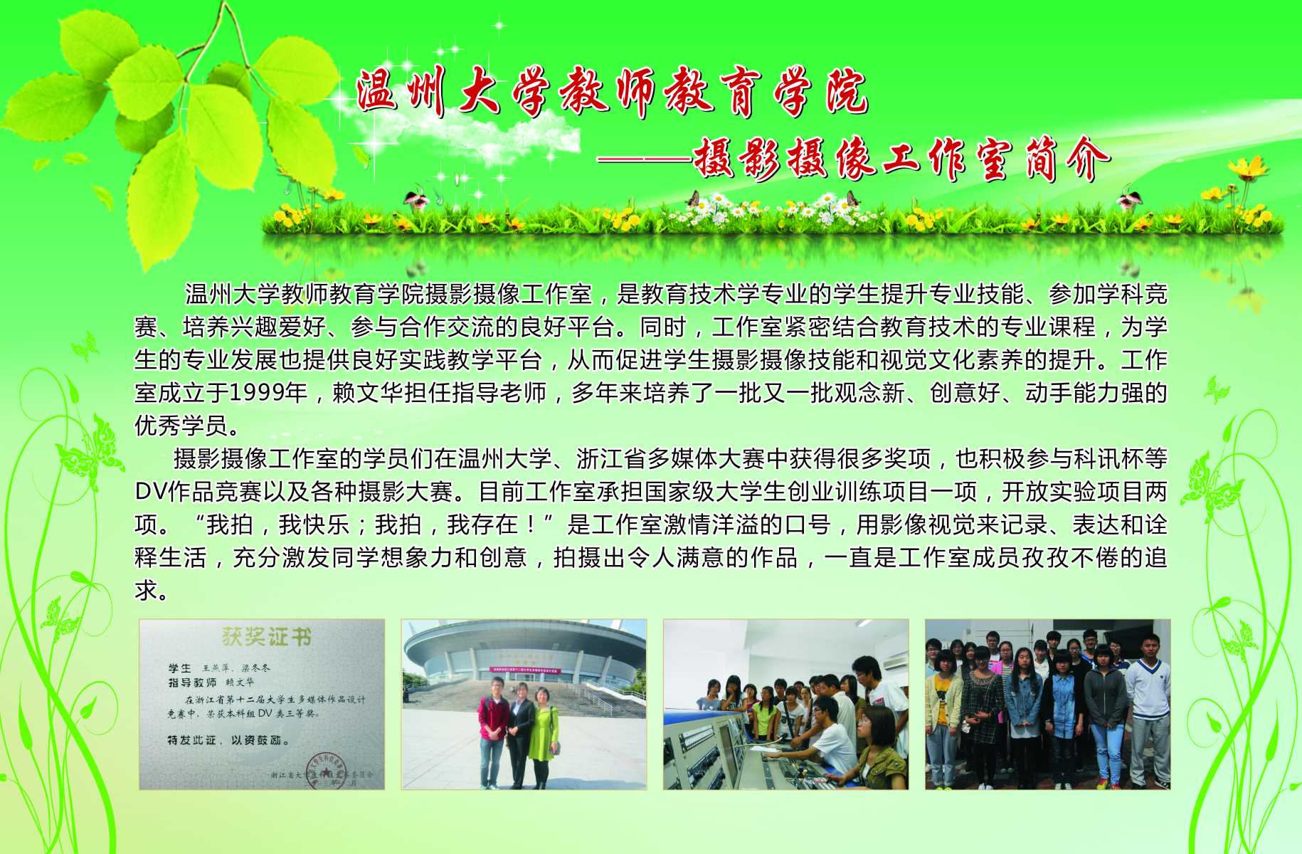 13个学生专业工作坊的简介、师生合影、培训及成果照片等。学院专业工作坊在各位工作坊专业老师指导下,学生在自身综合素养及品质得到提升的同时,参与各类省市、乃至全国的比赛,扩大学校、学院的声誉。近三年泥巴影院