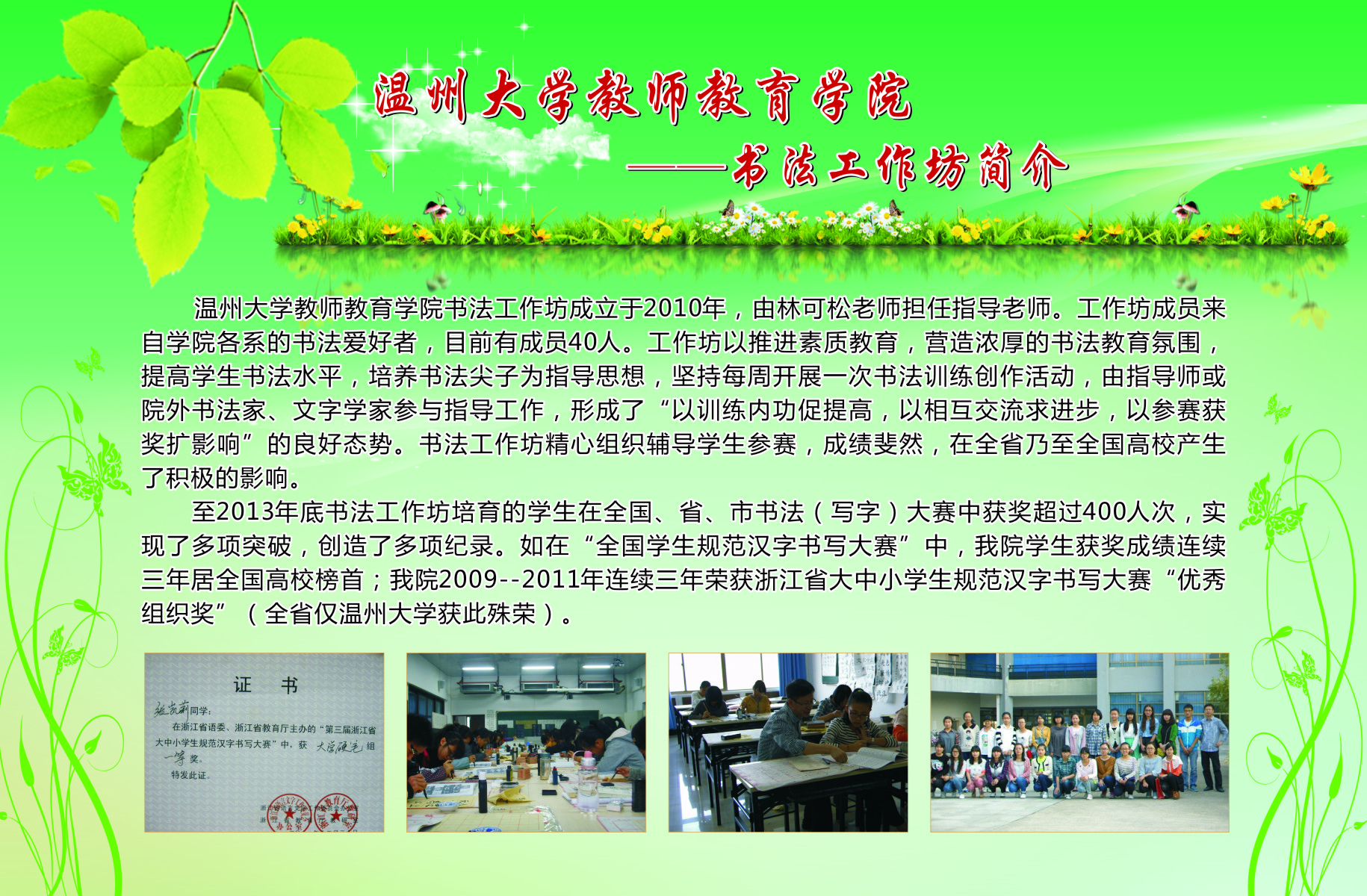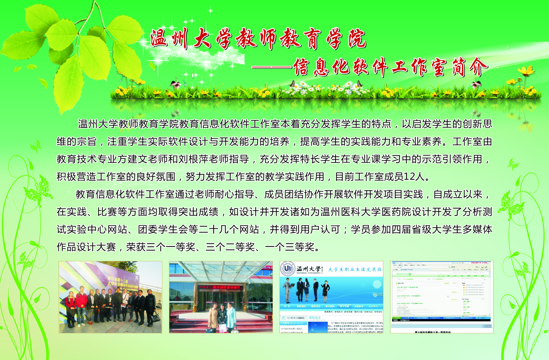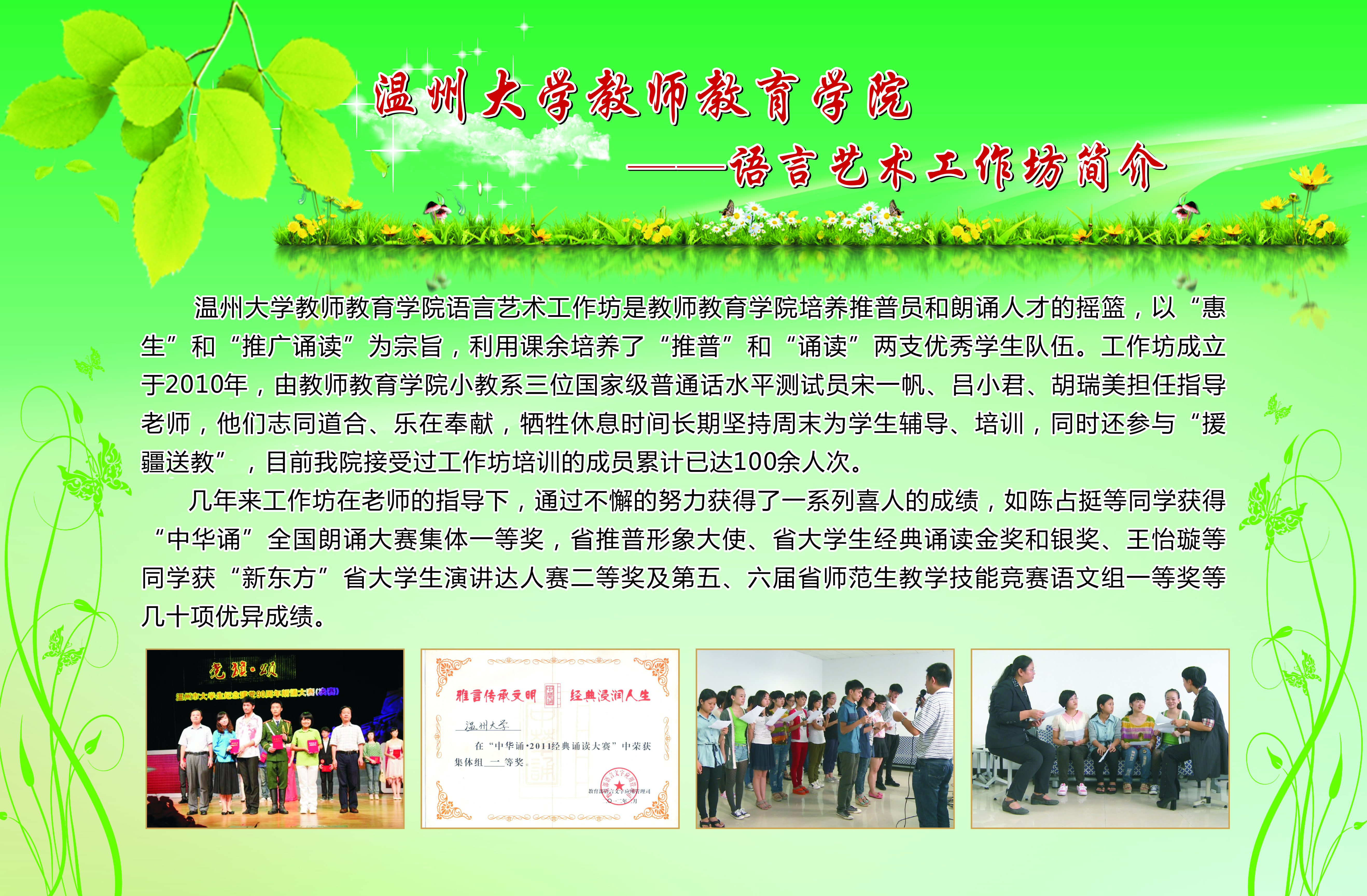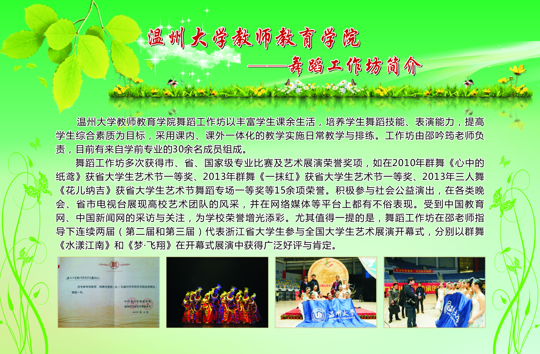 13个学生专业工作坊的简介、师生合影、培训及成果照片等。学院专业工作坊在各位工作坊专业老师指导下,学生在自身综合素养及品质得到提升的同时,参与各类省市、乃至全国的比赛,扩大学校、学院的声誉。近三年泥巴影院