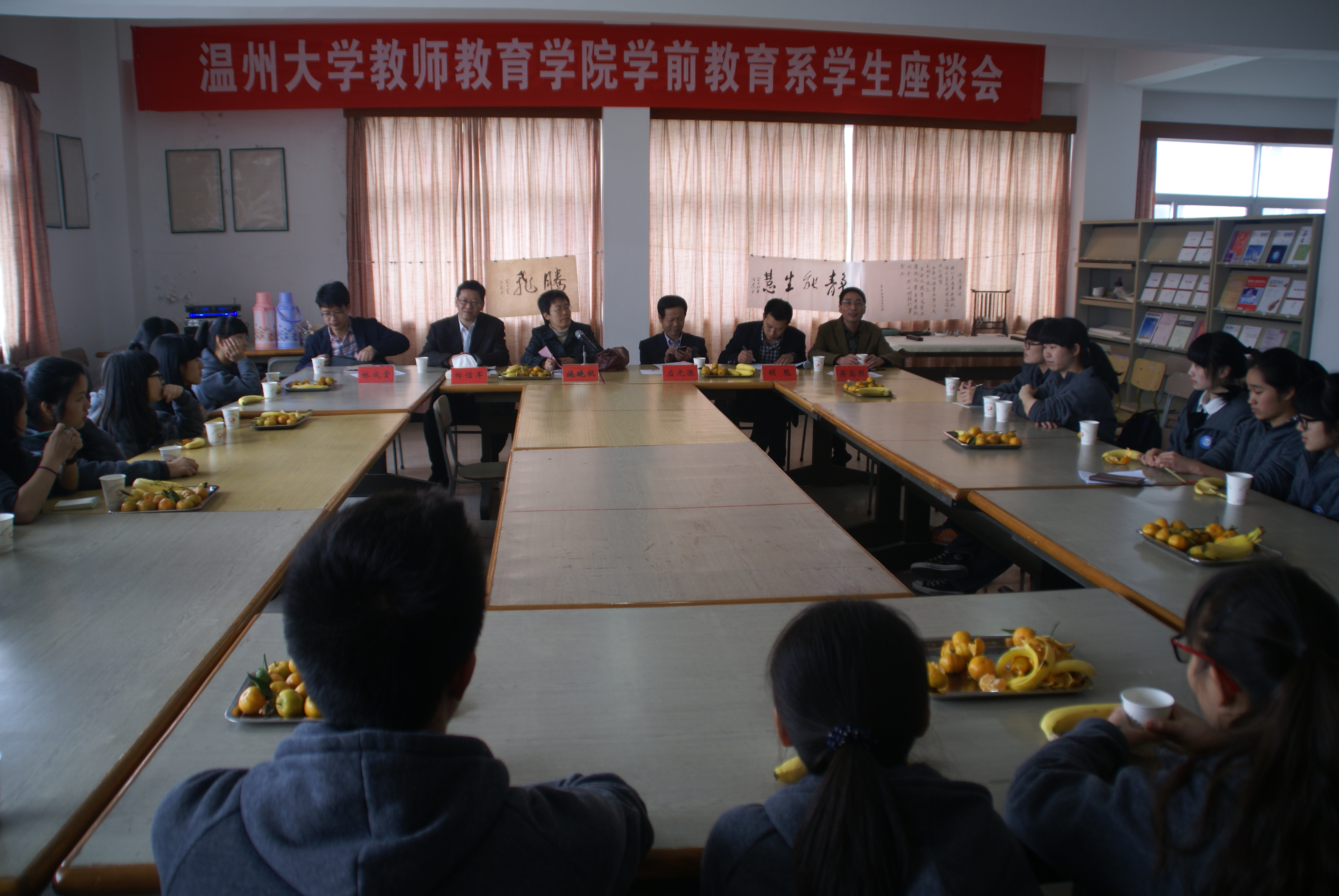 另一组由副院长孙芙蓉、教学科长何笃玉、学前系主任曾国老师组成,与教师们就教学相关问题进行交流,曾国老师解读了教学大纲的制定,三升四考核标准,并对乐清教学点提出的聘请学前教育资深人士作为学校的专业领路人想法表示肯定,何笃玉老师对各门课程的进度、要求进行指导,孙院长详细解答了教师们关心的温大与中小学基础课题合作项目的流程与要点,并建议今后双方的教学交流活动更加具体到每一门课程。乐清教学点副校长戚强健、郑晓及各科教师参加了研讨会。