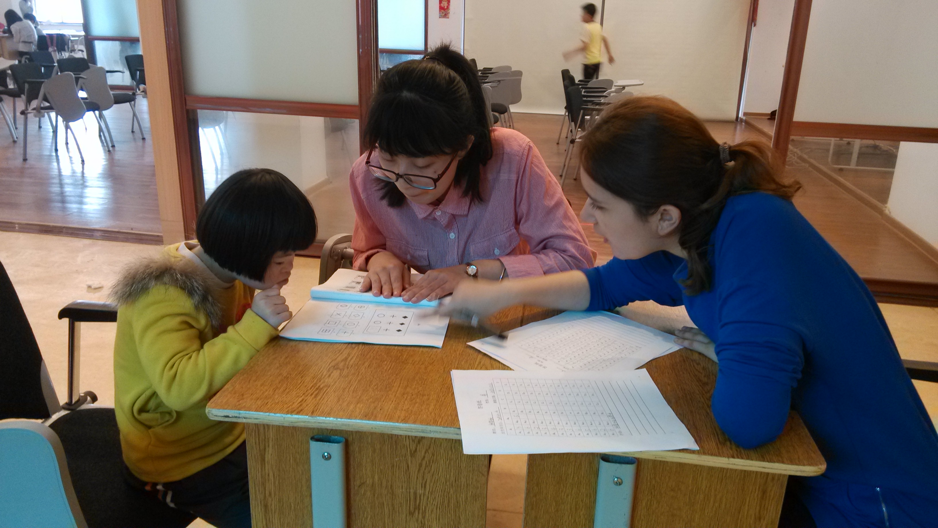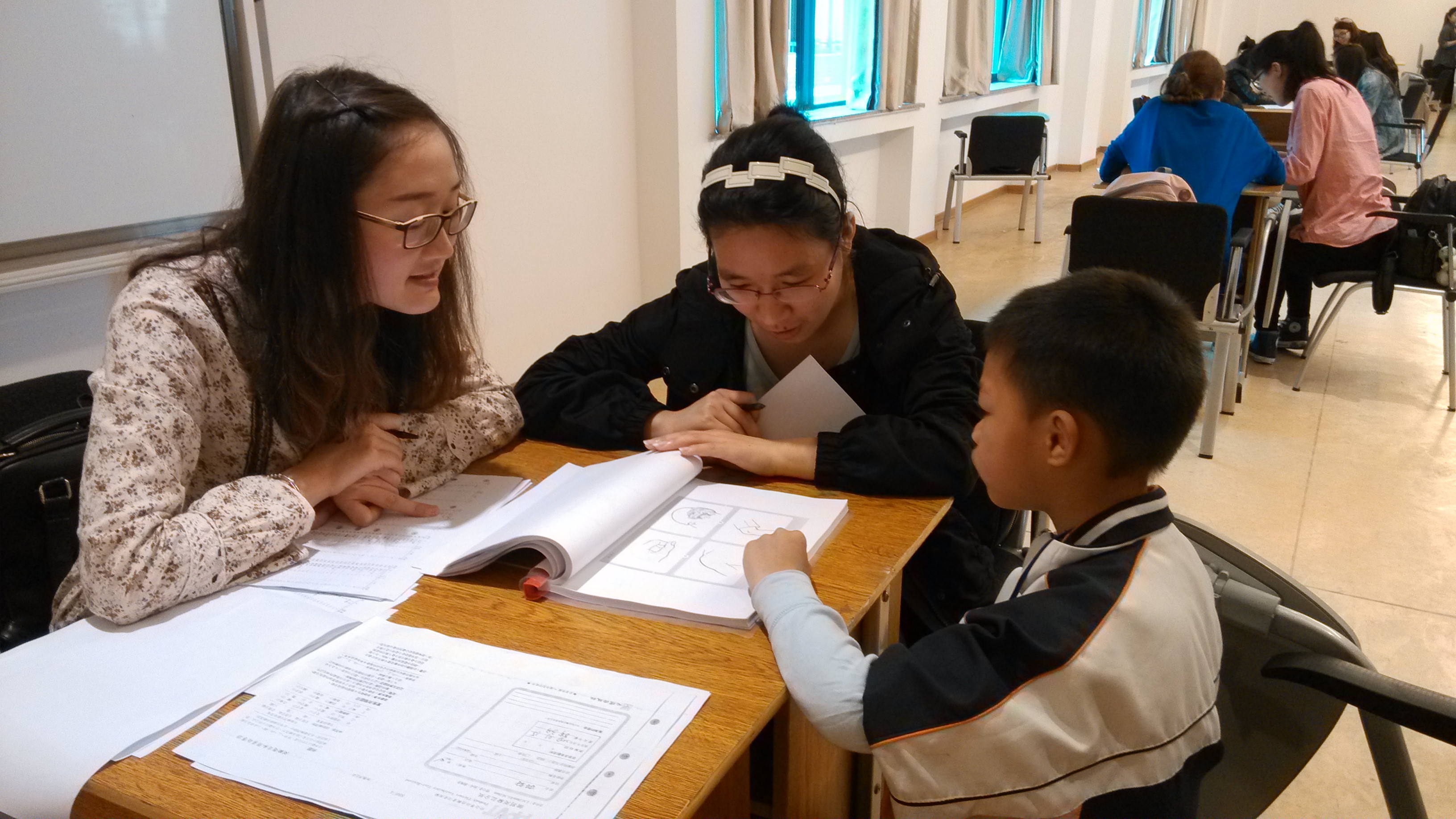 在本次测验中,我们发现,对于特殊儿童,PPVT测验相对来说好实施一些,因为指导语相对简单,对孩子心理能力的要求也相对低级一些。而瑞文推理测验相对较难施测,尤其是后面涉及到一定要推理的题目,因为指导语较难说,对孩子心理能力的要求也较高。有些低年级的自闭症儿童甚至很难理解指导语,导致施测无法进行。不过所有的特殊儿童都非常讨人喜欢,他们会在完成测验回教室前向你边挥手边说再见,有的也会在测试前叫你一声姐姐。虽然测验持续了一整天,但是我们觉着非常值得!