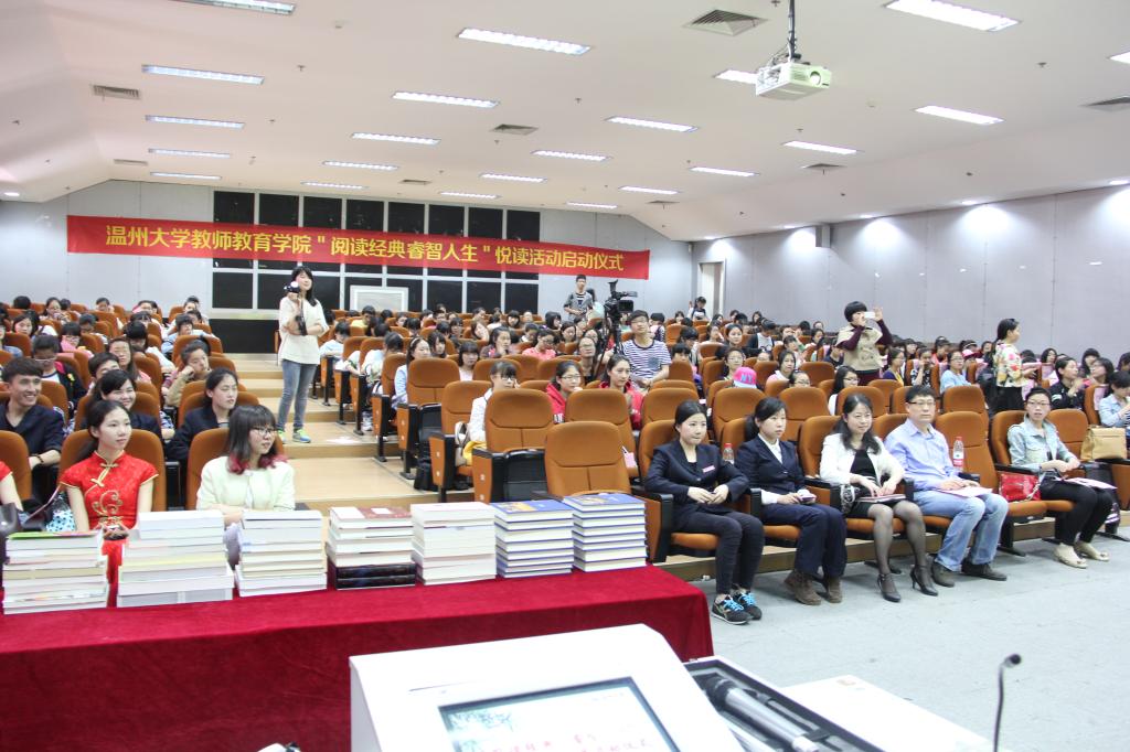4月份即将引来2014年世界读书日。为了进一步打造泥巴影院 “教师教育”特色,推进“博 爱 雅 艺”师范气质培育计划的实施,4月16日下午在南校会展中心叶适厅,温大教师泥巴影院 启动“阅读经典 睿智人生”书香教育悦读活动。校学生处处长蔡联群老师、泥巴影院 党总支副书记嵇小怡老师等领导老师,温州书城的领导老师,及250余位学生参与此次活动。
