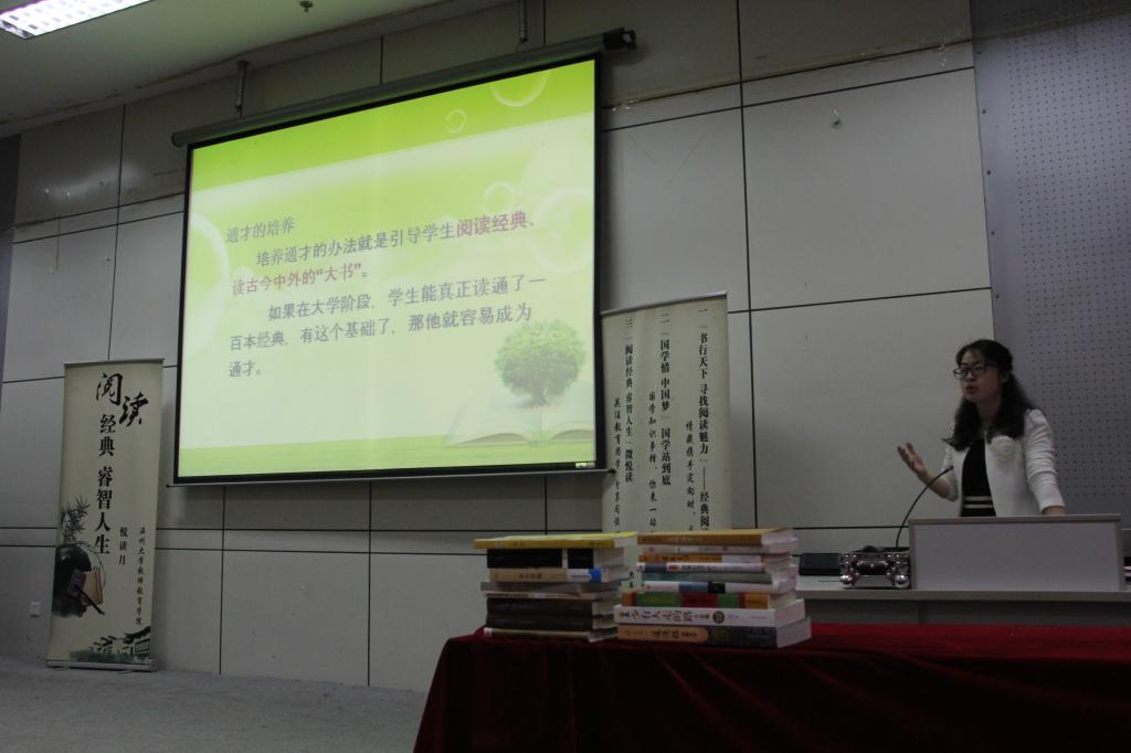 党总支副书记嵇小怡老师进行微讲座:《青春正是读书时——让阅读成为一种生活态势》。她从当下大学生的阅读状况、大学生阅读的价值梳理,以及大学生阅读的几点建议做了深刻的阐释,并提出四点建议:一、大学生的读书学习一定要转变观念,有自主意识,学会根据社会发展需要和个人兴趣进行系统的知识配置。要有一定量和宽度的阅读体系。二、阅读内容:哲学精品著作、文学名著、关注社会现实的作品,充满理论色彩的作品、史学专著、领导人的著作,学科知识最前沿的知识。三、树立图书馆网络系统搜集信息的意识,使用网络搜索信息的能力。四、不时不读,无处不读。