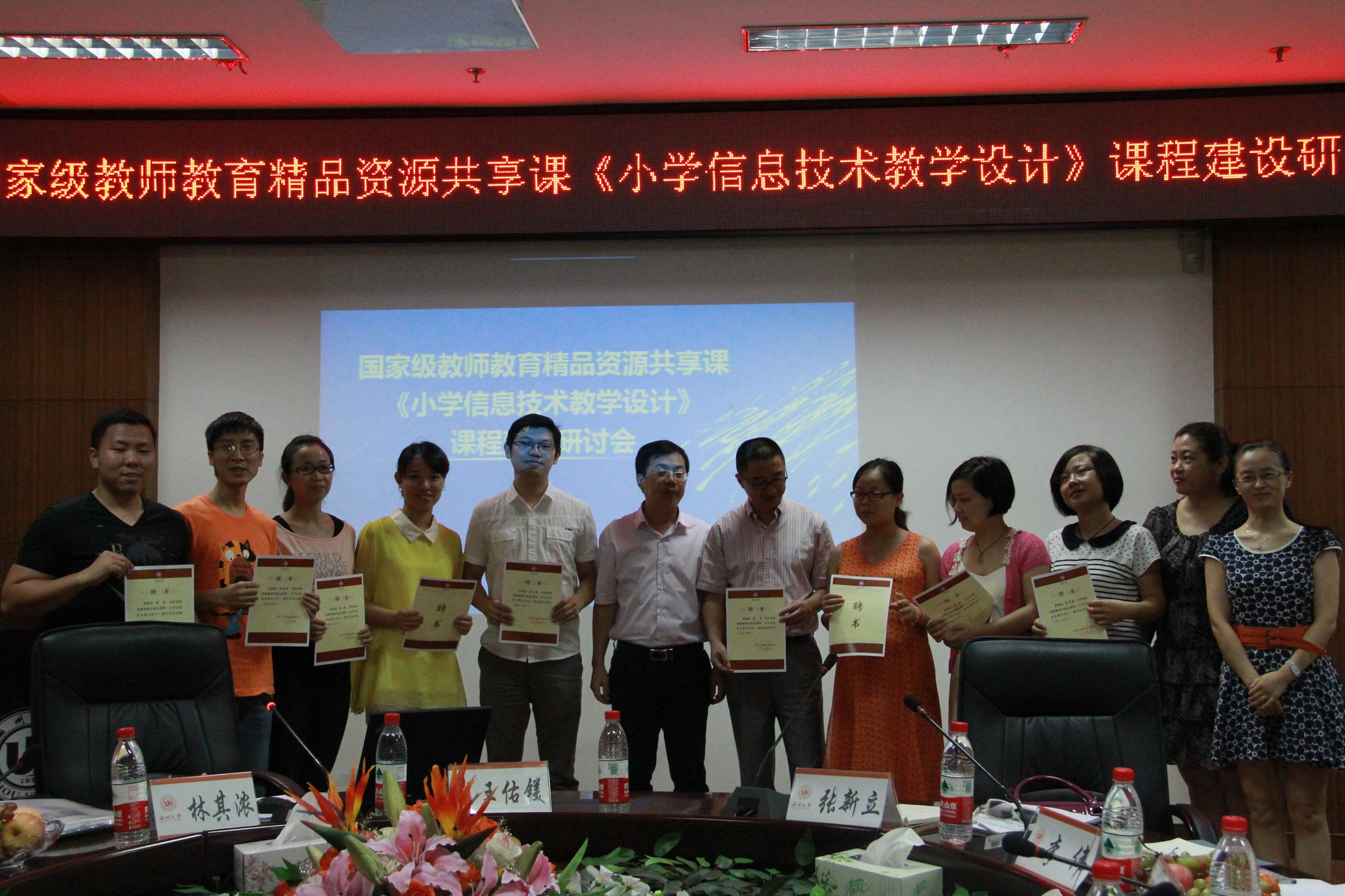 本次研讨会目的在于深度推动国家级精品资源共享课建设与实施,同时聚合区域优秀师资和资源参与课程与专业建设,以提升课程建设的实效性。在简短的开场白之后,王佑镁博士和张新立博士向四位信息技术教研员蒋莘、唐小挺、朱虹、黄菊敏等颁发了课程建设顾问聘书,向谢贤晓、林绮丽等九位名师颁发了课程实务导师聘书,向林其浓等颁发了课程技术顾问聘书。随后,王佑镁博士对国家级教师教育精品课程建设的背景与意义、本项目的设计方案进行了系统阐述。