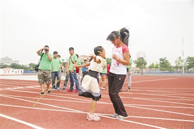 志愿者与孩子们在操场上跳绳。