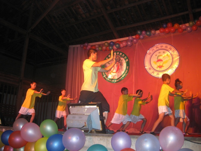 在主持人介绍到场嘉宾之后,安民乡文化站站长、义工团助学负责人发表讲话,他们分别介绍了此次支教活动和演出概况。随后,全体乡干部的一曲《歌唱祖国》为此次演出开了一个好头。我们共同放声歌唱,歌唱我们伟大的祖国,祝愿祖国繁荣昌盛!在此次演出中,孩子们的节目形式多样,表现可圈可点,一度将全场氛围推向高潮。一曲《水调歌头》,孩子们清脆的嗓音,舒缓的语调,带出词人几分惆怅几分豪情;17个孩子的T台秀引来阵阵叫好声,颇具个性的手工作品,配上孩子们或甜美可爱或帅气洒脱的pose,使得全场掌声不断;师生对唱中,陈巧军老师和周萍萍同学合作默契,“一条大河波浪宽,风吹稻花香两岸”,悠扬的歌声仿佛把我们带到那个激情燃烧、慷慨激昂的年代里;而我们的武术表演《太极》更是全场的一大亮点,在袁路生老师的带领下,孩子们打得有模有样,颇有风范;课本剧《金色的鱼钩》,小战士的表现稍显稚嫩,然而那种对老红军的敬意仍从他们的表演中流露出来。闪闪鱼钩,它所包含的那种对党的忠诚、对抗战的坚守、对同志的关怀,时至今日,仍然值得我们学习。之后,孩子们还表演了《英文字母歌》,在音乐的带动下,孩子们边唱边跳,十分可爱;活力十足的舞蹈《嘻唰唰》更是点燃的大家的激情,台下的观众甚至忍不住跟着音乐一起唱起来。近半个月的支教活动,孩子们都有所收获。在学到一些技能的同时,更加懂得了自信,懂得了在大家面前展示自己。在此次演出中,由各村选送的二胡独奏《北京有个金太阳》、革命样板戏《沙家浜》选段《智斗》、越剧梁祝选段《十八相送》,由义工团选送的独唱《萤火虫》、葫芦丝独奏《清清玉湖水》、古筝独奏《山丹丹花开红艳艳》都相当精彩,让嘉宾们止不住得鼓掌喝彩。杨金跃书记也在大家的带动下,现场给我们来了一首《为了谁》。同时,实践队全体成员和义工团部分成员分别为我们带来手语表演《和你一样》及《感恩的心》。最后,演出在《明天会更好》的音乐声中落下帷幕,全体演出人员一起演唱了这首歌。