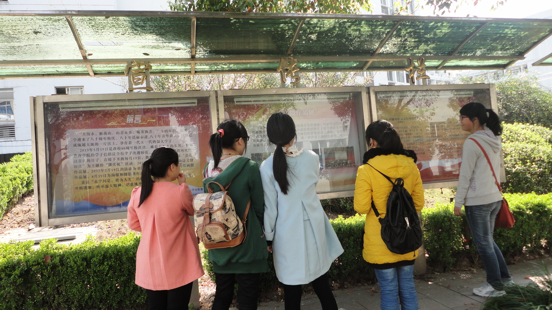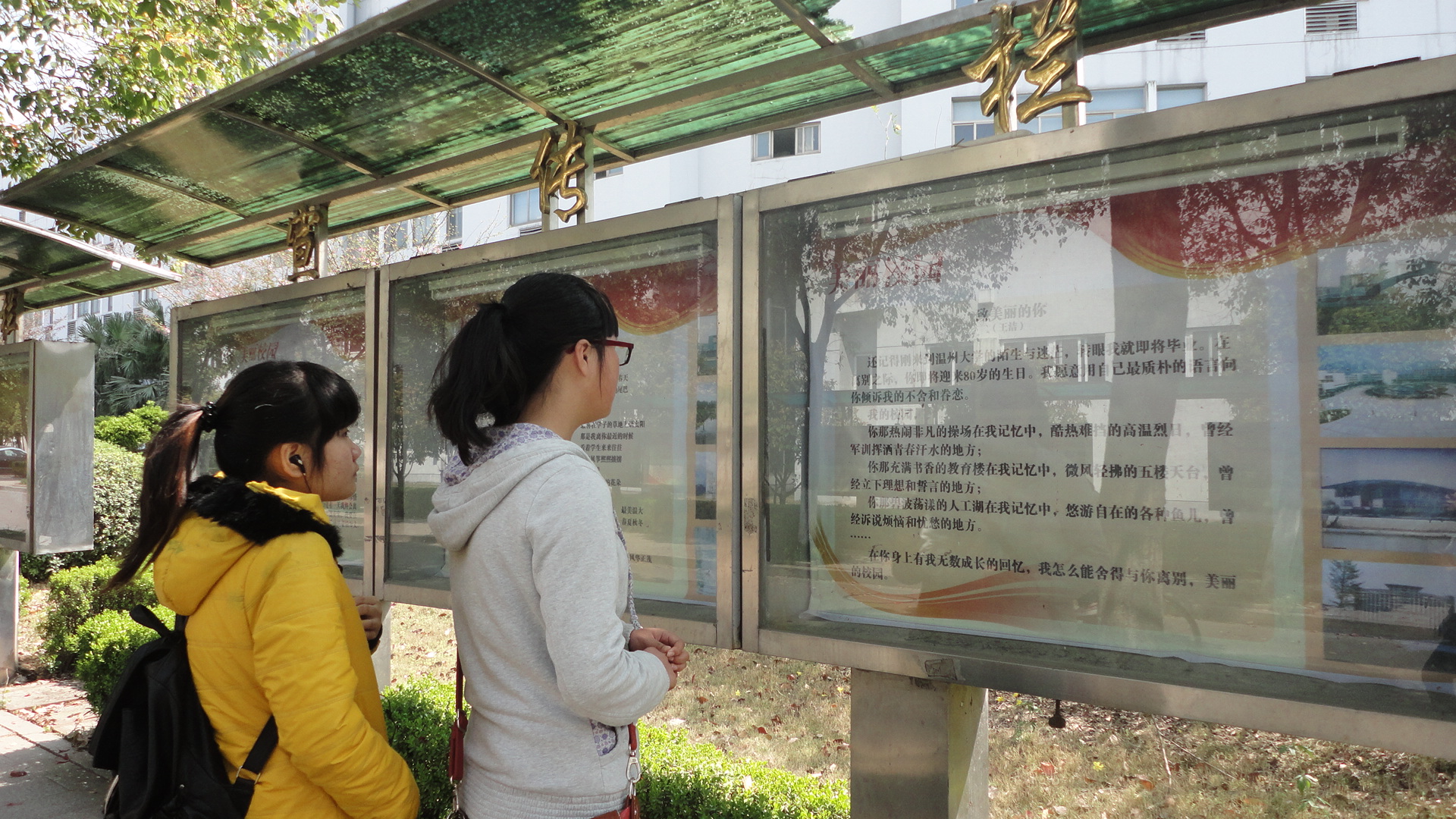 学子校庆微诗文展在北校宣传栏展出,取得了良好的反响。许多师生驻足观赏、品评。