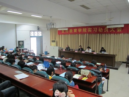 1031日下午1:00,在学院教务科的组织下,09教技、09心理、09学前实习动员大会在北校3号楼101大教室胜利召开了。出席本次会议的有学院分管副院长彭小明教授、各系主任和书记、各系带队指导教师,以及09教技、09心理、09学前专业126名同学。本次动员大会由教务科胡孙贵老师主持。