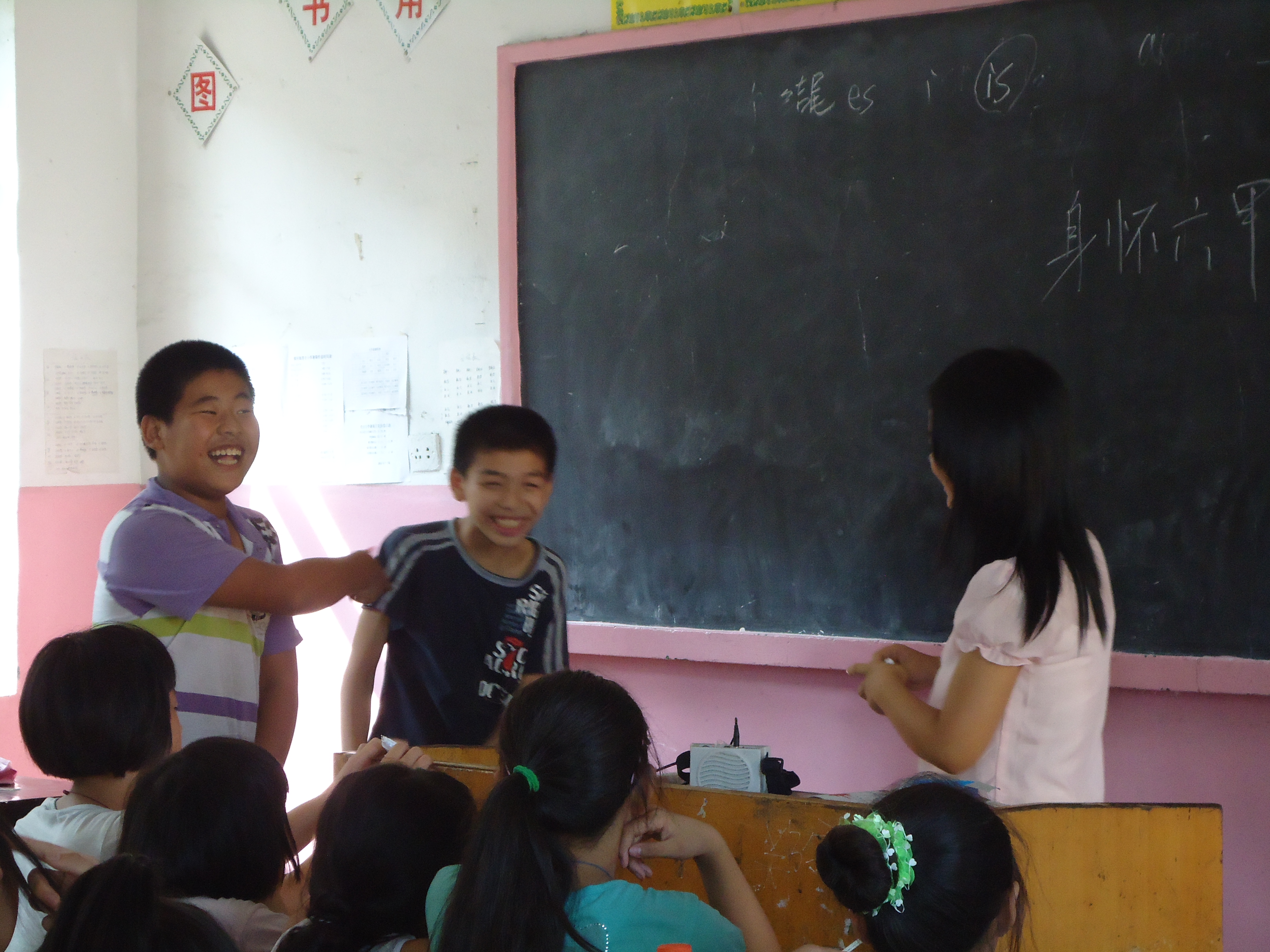 在上一周的教学中,心理班会可谓是广受好评,于是,我们决定这周给每个年级都加设一节心理班会课,让孩子们在游戏中敞开心扉,相互学习,共同成长。今天,五年级的主题是“沟通与协作”,主要通过游戏“你做我猜”来进行。无巧不成书,同学们抽到的第一个题目就是“身怀六甲”,这下,男孩们不乐意了,女孩们也是连连摇头,大家你推我让,眼看就僵持在那儿了。这时候,老师“挺身而出”,夸张而又惟妙惟肖地模仿起孕妇来,在同学的哈哈大笑和齐声高喊“身怀六甲”的气氛下,游戏继续进行,大家玩得学得都很尽兴。