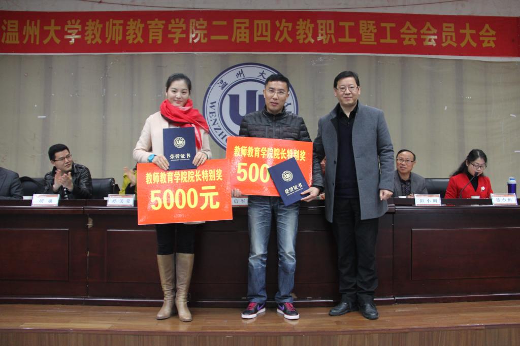在颁奖环节中,学前教育系艺术教育团队、教师教育实验教学中心荣获2014年度“院长特别奖”;杨健、刘海霞、金建钰、陈恩清、陈旭微、章春和、朱江海等七位老师及就业专职人员因就业工作突出荣获就业工作奖励;金荣乾、郭文斌、朱伟、张龙、胡丹、胡雯、卢佳、李伟、谭莉等九位同志获得了工会活动积极分子的荣誉称号。