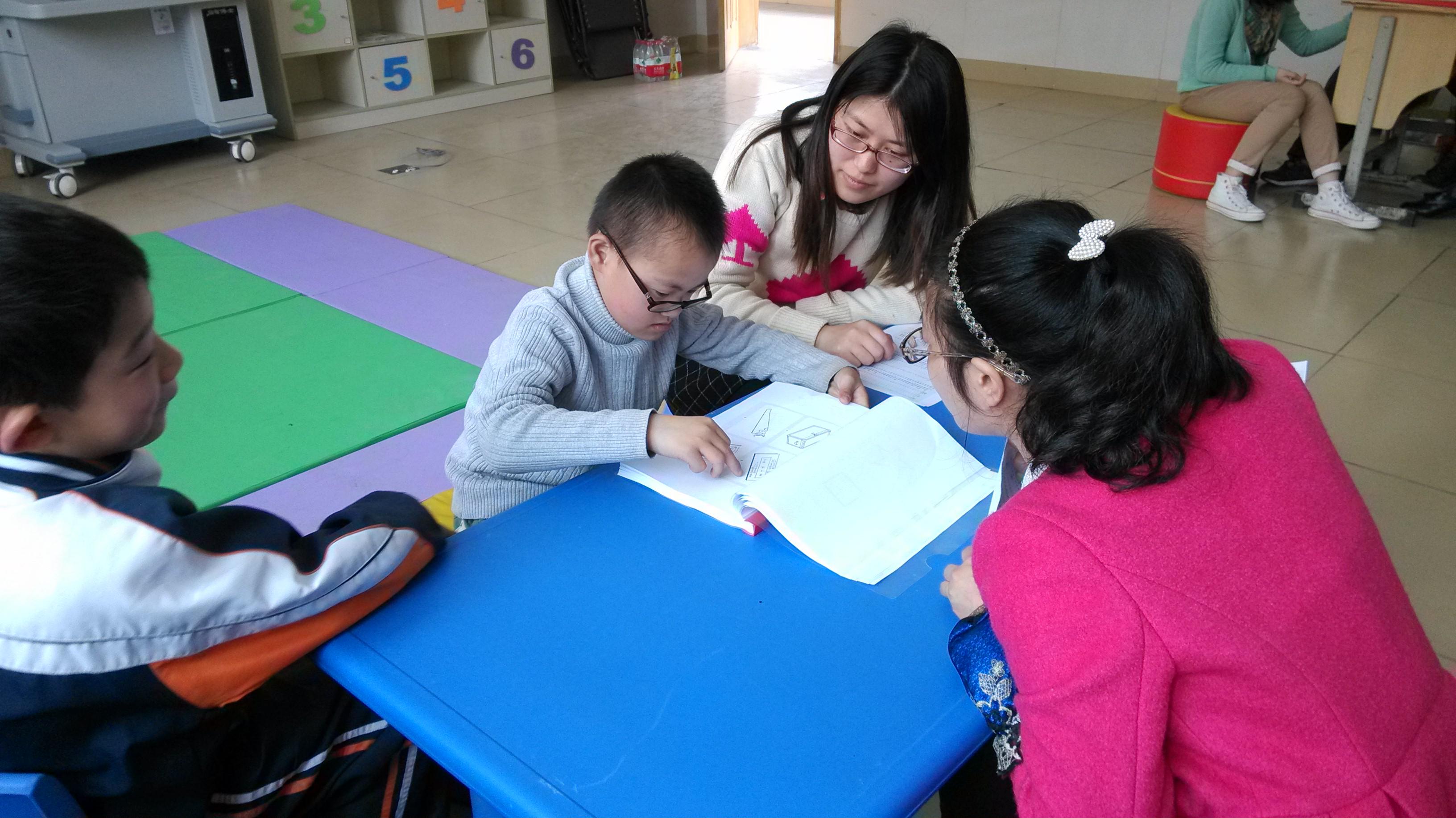 本次测试的对象是特殊儿童,主要包括自闭症儿童和智障儿童。我们这次所选用的测验是PPVT和瑞文推理测验联合型,两个测验均为非文字测验,适合对特殊儿童进行测试。PPVT可供2.5岁到18岁的儿童使用,测量言语有困难的人及聋人的词汇使用能力,是目前美国智力落后协会(AAMD)所使用的一种常用智力测验工具。瑞文推理测验联合型可供5岁到75岁的人使用,主要测量推理能力。我们分别在6个教室对孩子们进行测试,每个教室3组。因为测试的对象是特殊儿童,所以每2个成员测试一个特殊儿童,一个用生动清晰的指导语向儿童施测,另一个在一旁观察记录每一位儿童答案及做题状态。由于测试对象的特殊性,有些孩子还是不能很好地配合,往往使得测试无法顺利进行。于是我们就会采取各种措施,尽力使孩子们能进行测试。如果实在不行顺利进行测试的,我们也会和孩子们做游戏,使孩子们开心。在整个测试过程中,各个小组认真负责地进行测试,而陈老师除了指导、组织、协调各个小组测试外,还积极主动地和老师或家长进行沟通,了解特殊儿童的心理行为及矫治方法。