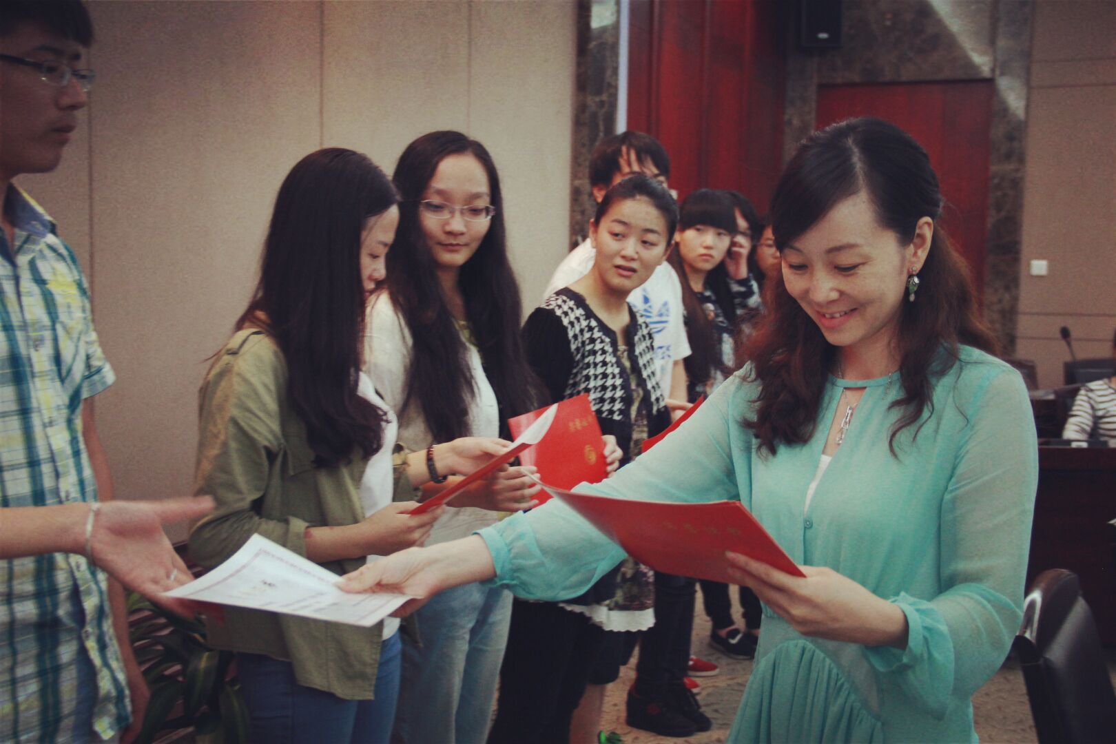 会议上对2014-2015学年第二学期知心姐姐工作积极分子进行了表彰,杨丽君副书记为他们颁发获奖证书,激励他们在今后的工作中继续努力。之后,知心姐姐各服务队做了精彩的队伍文化展示。华侨队为给华侨子女带去爱和鼓励,为他们进行课程学习、心理辅导等,叶依纯队长指出,队员们对孩子要耐心引导,细心指导。海岛志愿服务队的楼倩颖同学深情地讲述道:“海岛队是一个温暖的大家庭。不管是老队员还是新队员,都是我们队伍必不可少的组成部分。”她提出海岛队主张心理班会和主题班会相结合,给孩子们带去知识与幸福。正如楼倩颖同学所讲的“没有一个工作比教师这个职业收到的回报更多”。留守队的队长竺凯娜,在介绍完任务分工后提出家长与学校学生,知心队员的交流互动,是留守队的一大亮点,并提出在往后的会议中,让大家多提建议,让知心队伍能够越来越好。民工队的队长鲁琪柯发表感言,她提出了民工队一直以来的理念“实施大手牵小手,帮助民工孩子能够健康成长”。在给3、4年级的小学生上课时,以手工、绘画、心理辅导、朗诵、科学实验为载体,并结合丰富的主题班会,让他们在智慧的天空中展翅高飞。"知心姐姐"新成员代表黄天宇也做了深情表态发言。她表示虽然还没有参加过活动,但是她已充满期待,将用所有的热情和爱投入知心的活动,用心珍惜这难得的机会,用心去做好志愿服务。