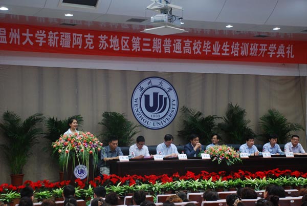 的情况,并从学习、生活等方面表达了对阿克苏学员的关心。学院领导郑信军代表培训教师发言,他介绍了学前教育专业的办学历史和师资状况,表示全院教师将高度重视阿克苏学员的教学工作,认真执行人才培养方案,保质保量完成预定的教学任务。新疆培训学员代表马热古丽·尼亚孜代表阿克苏学员发言,她表示将认真珍惜学习机会,化对家乡的思念为学习动力,以刻苦学习来回报政府领导、两地老师的关怀。教育厅计划财务处副处长陈达,新疆阿克苏地区行署副专员李更生分别作重要讲话,他们强调了阿克苏学员要培养过硬的政治素养和业务能力,为家乡建设作贡献。
