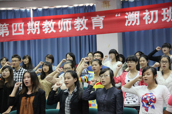 接着,刚毕业的第二期“溯初班”学员代表、现工作于温州实验中学绣山校区的陈琦老师向第四期“溯初班”的学员分享了自己作为“溯初班”学员的经历和收获,并对新学员们提出了自己的见解和期望。在第四期“溯初班”班长蔡茜蒙同学代表新学员讲话后,她带领全体溯初班同学进行了宣誓仪式。简短的誓词读出了溯初学子的坚定教师事业的决心。泥巴影院
