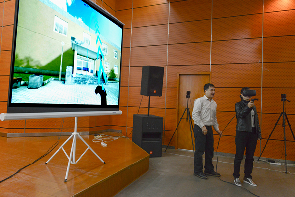 发展概况,在明确“博爱雅艺”的师范气质培养目标的同时,提出教室+课堂(6+4)的途径,他先通过视频介绍的方式,夺人眼球。在展示虚拟课堂演示后,又请志愿者嘉宾现场体验,带领全场参观电脑室,化学实验室等不同的教育场景类型的教室,他独特的演绎方式的效果相当精彩,获得了在场所有观众的掌声。