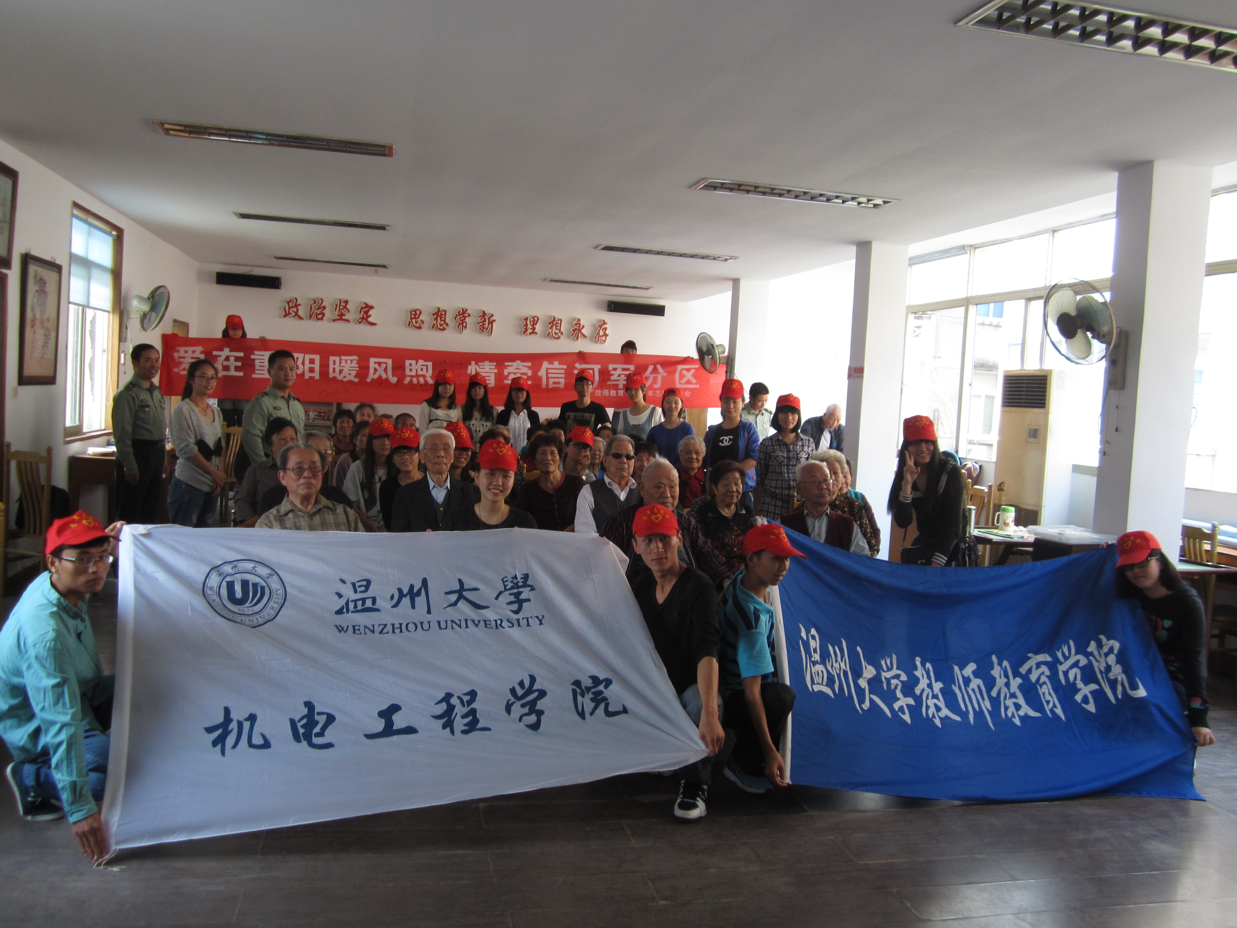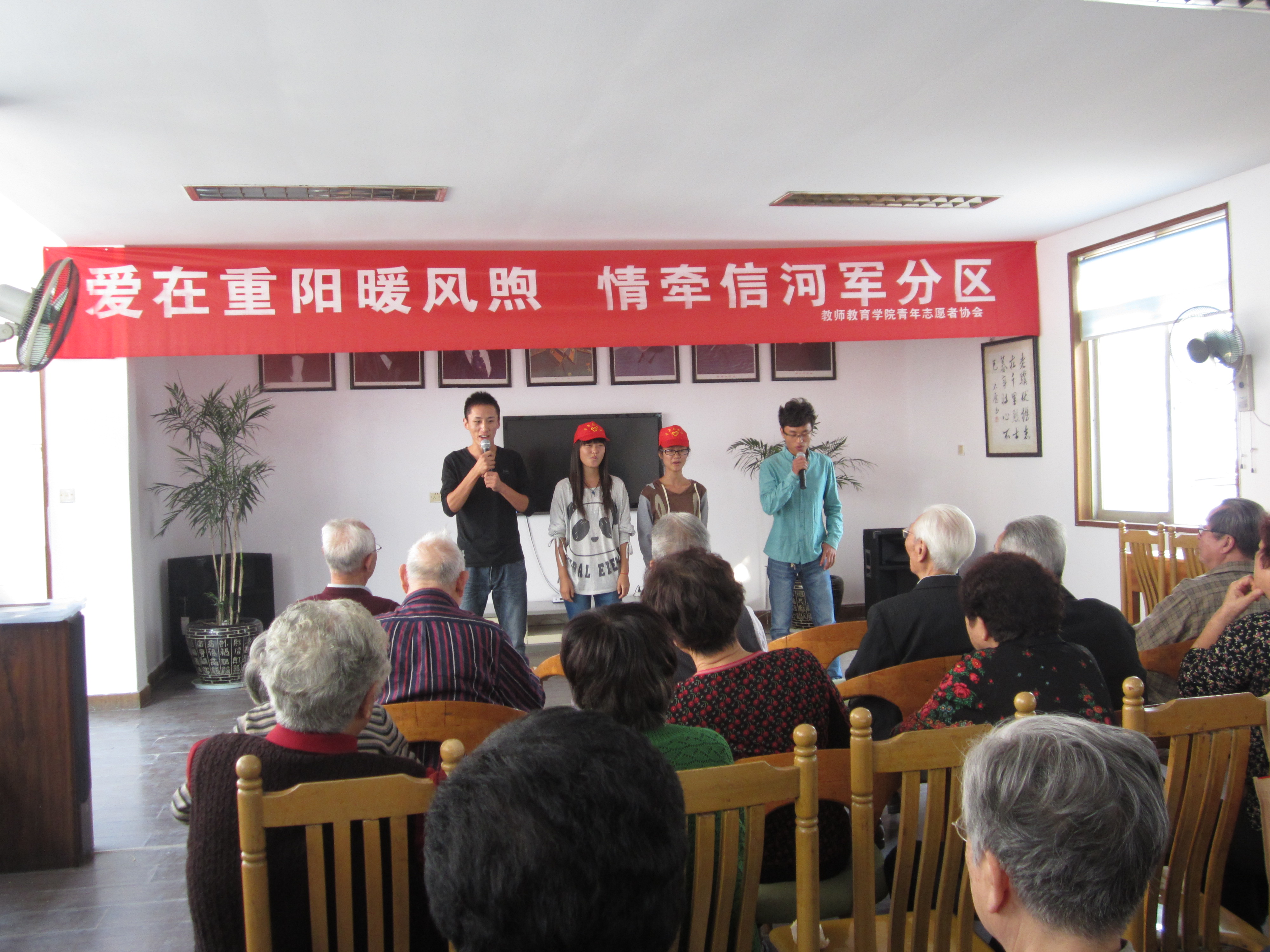 主办、机电工程学院协办的重阳敬老志愿活动,在位于信河街的军分区展开。下午2点,志愿者们在军分区内忙碌地布置着场地,以期呈现一个完美的演出场地。50分钟之后,场地布置告一段落,重阳节慰问演出正式开始。首先是由军分区负责人杨叔叔带来的一段讲话,表示了对远道而来的学子们的感谢以及对接下来精彩节目的期待。紧接着,来自教师泥巴影院