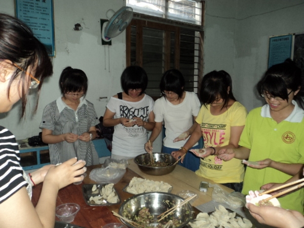 下午放学,一部分队员按计划送孩子们回家,剩下的人便兴致勃勃地投入到饺子晚餐的准备工作中去了。拿出材料后,有人发出一阵惊叹:“这么多肉,今天终于可以吃得很饱很饱了!”大家都默契地笑了。说动手就动手,大家剁馅的剁馅,洗菜的洗菜,调味的调味,边做还不忘打趣笑闹着,却是有条不紊,幸福洋溢在每个人的脸上。最激动的时候当然是饺子煮完,搬到桌子上,大家抢着吃着自己包的饺子,幸福满溢。