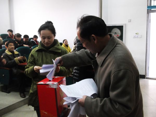 会议的第一项议程是由李方强同志组织全院教师对学院党总支工作开展测评,各位老师认真填写了自己的测评意见,投入票箱。