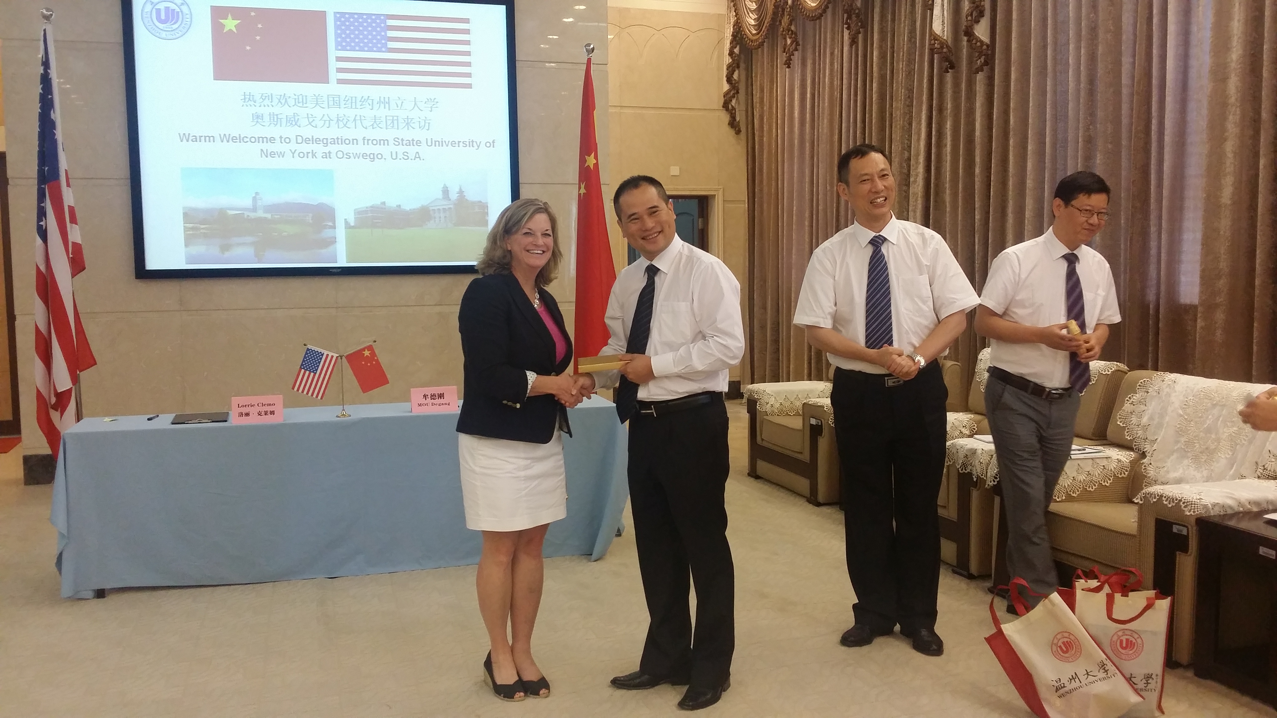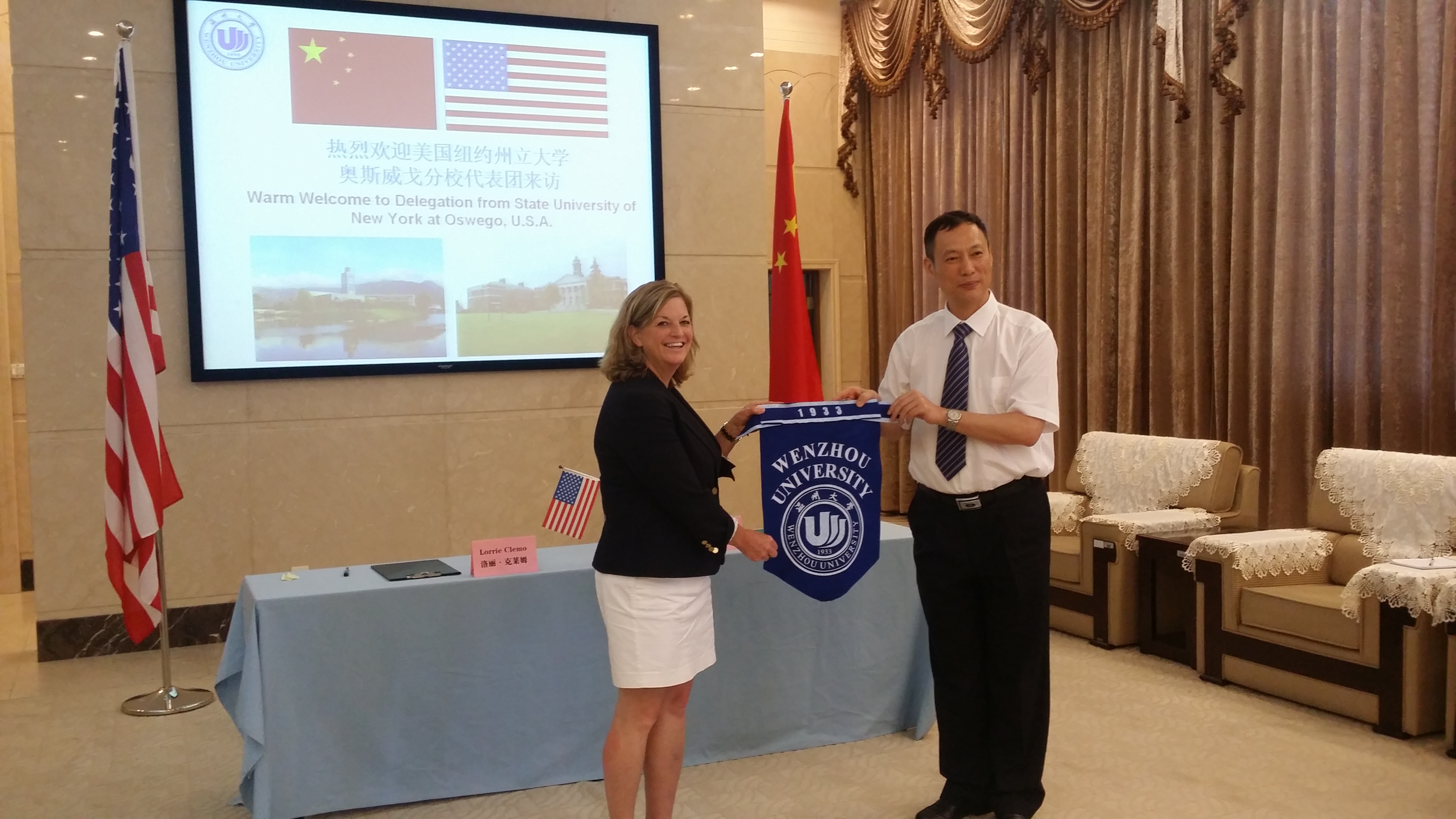 在会谈过程中,叶苗教授代表我校向克莱姆副校长一行介绍了温州的简介和泥巴影院 的校情校史。奥斯威戈分校国际项目负责人Jason MacLeod向我校介绍了该校的地理位置、专业设置情况和发展情况。