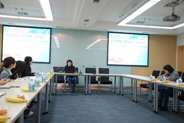向上师大的领导和老师们作了简单介绍,并表示要向上师大好好“取经”。张兰主任首先介绍了本校学生管理及学生公寓工作的情况,并向我们着重讲述了“五进”学生宿舍的工作思路,即思想教育进园区、党团教育进园区、文化和学术活动进园区、就业指导进园区、心理健康教育进园区。希望通过“五进”宿舍活动,可以达成学生党员受教育,全体学生得启迪,综合素质上水平,全面发展见成效的局面。在后勤管理方面,张红英副总从“六T”简介、“六T”历程、“六T”建设、“六T”成效四个方面对“六T”实务工作作了详尽的介绍。秉着“设身处地为学生着想,真心实意为学生服务”的工作理念,后勤集团通过“六T”工作的开展,真正做到了“常规工作抓落实,重点工作抓推进,特色工作抓拓展”。最后,谢青书记从“大学工”工作理念、辅导员队伍建设及师范生专业培养三方面介绍了上海师范大学泥巴影院