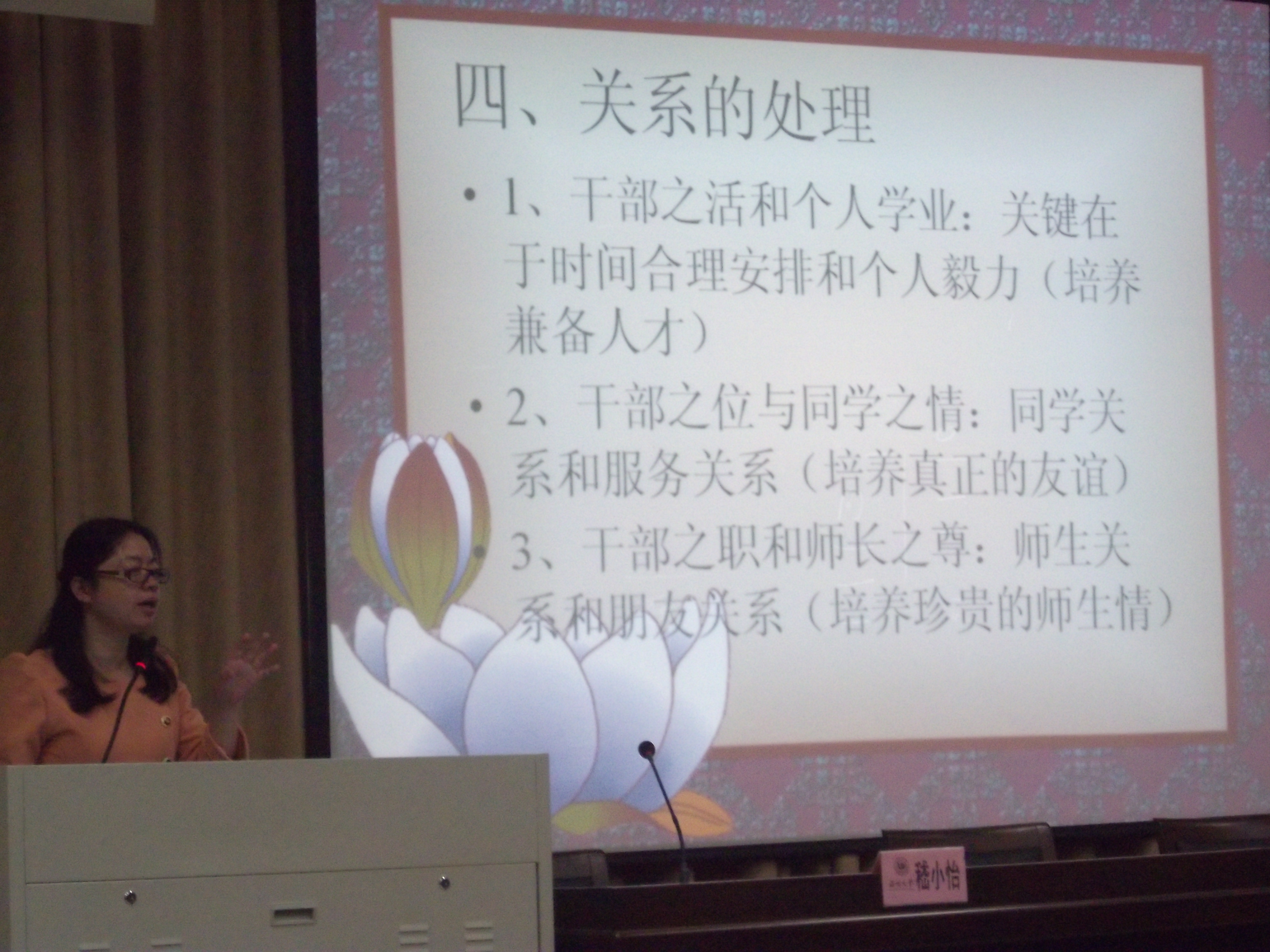 组织开展了由嵇小怡书记主讲的“2012年团学干部培训”的第一堂课。本次团干培训突破了单一的知识传授,提升了人文关怀的内涵,嵇小怡书记即称之为:工作是一种担当,收获是一种幸福。