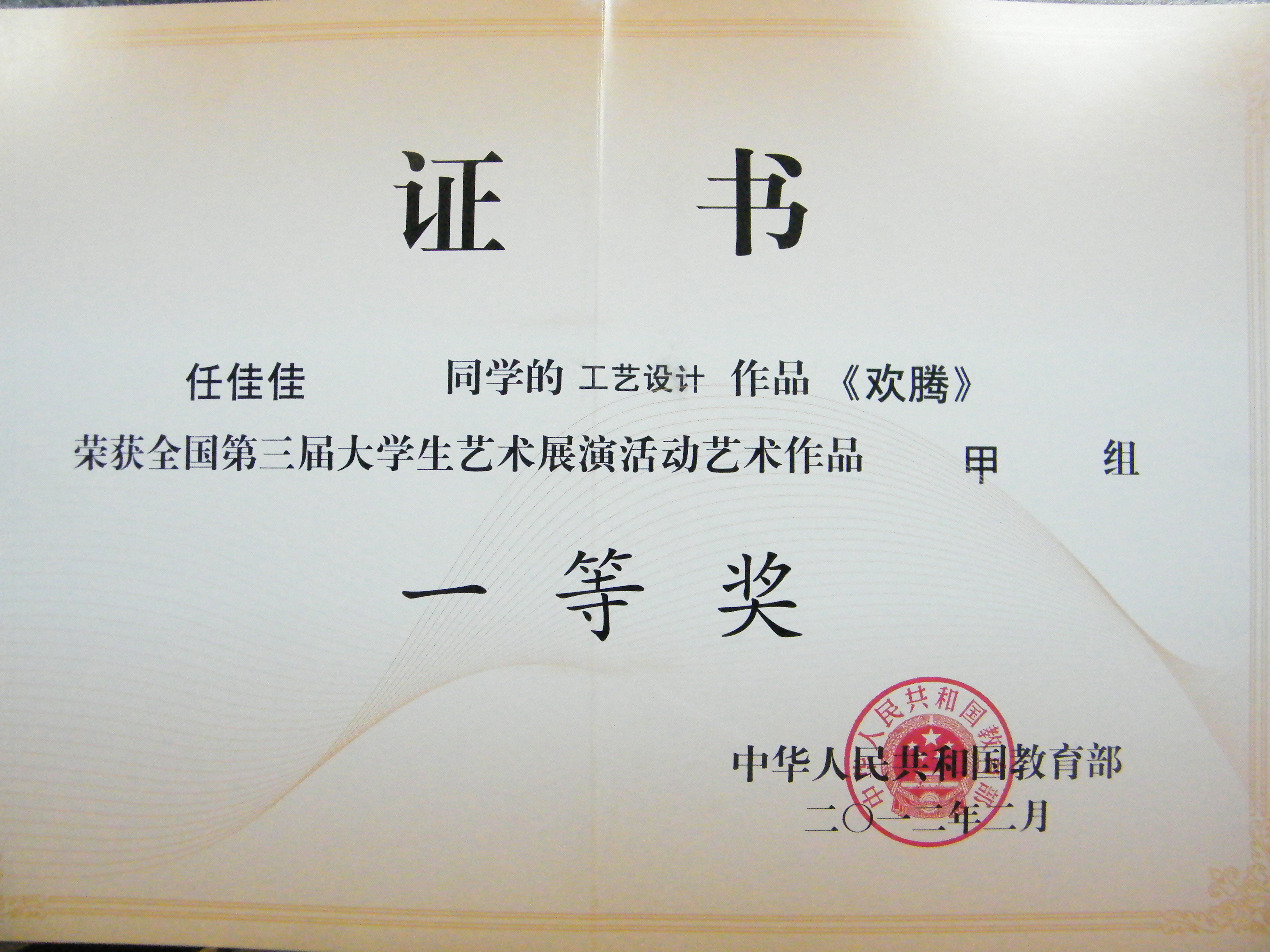 5、 2012.02第三届全国大学生艺术展演比赛二等奖。