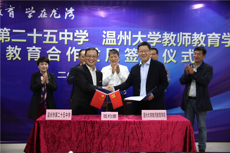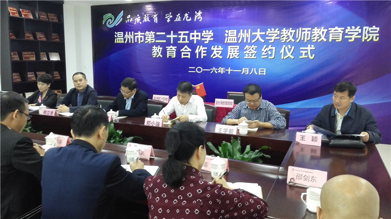 郑信军院长、杨立淮书记及学院办公室主任黄玮赴温二十五中签订教育合作发展协议。龙湾区教育局郑小强局长、王学朝副局长出席了本次签约仪式,龙湾区教育局王颖副局长主持仪式。