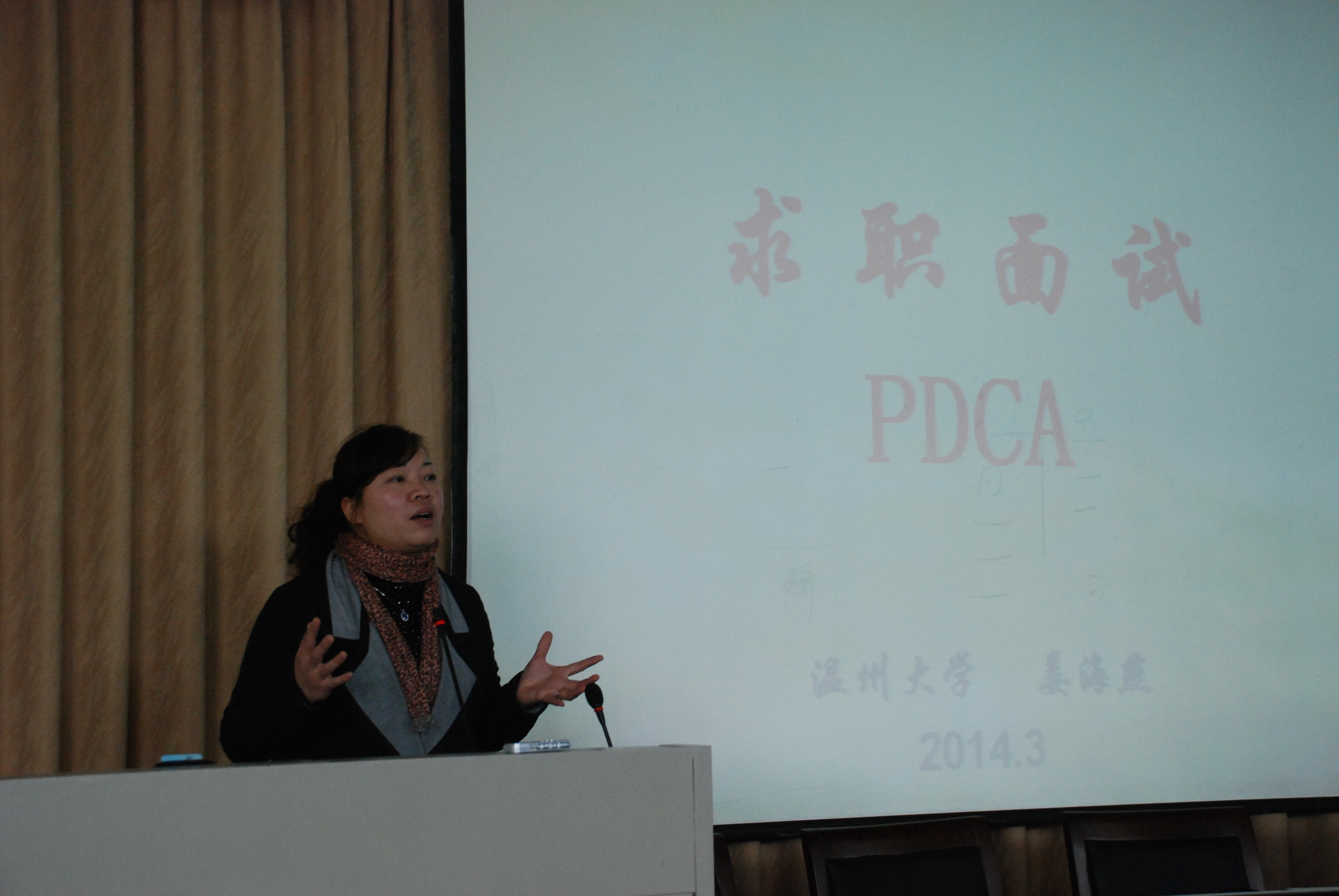 2014届毕业生适应就业形势,提高就业能力,2014年3月5日下午,学院特邀请了校就业处副处长陈宏毅、学生处副处长姜海燕两位就业指导专家为同学们开设了求职面试指导及简历制作指导实训,部分2011级的同学听闻这个好消息也纷纷过来聆听。